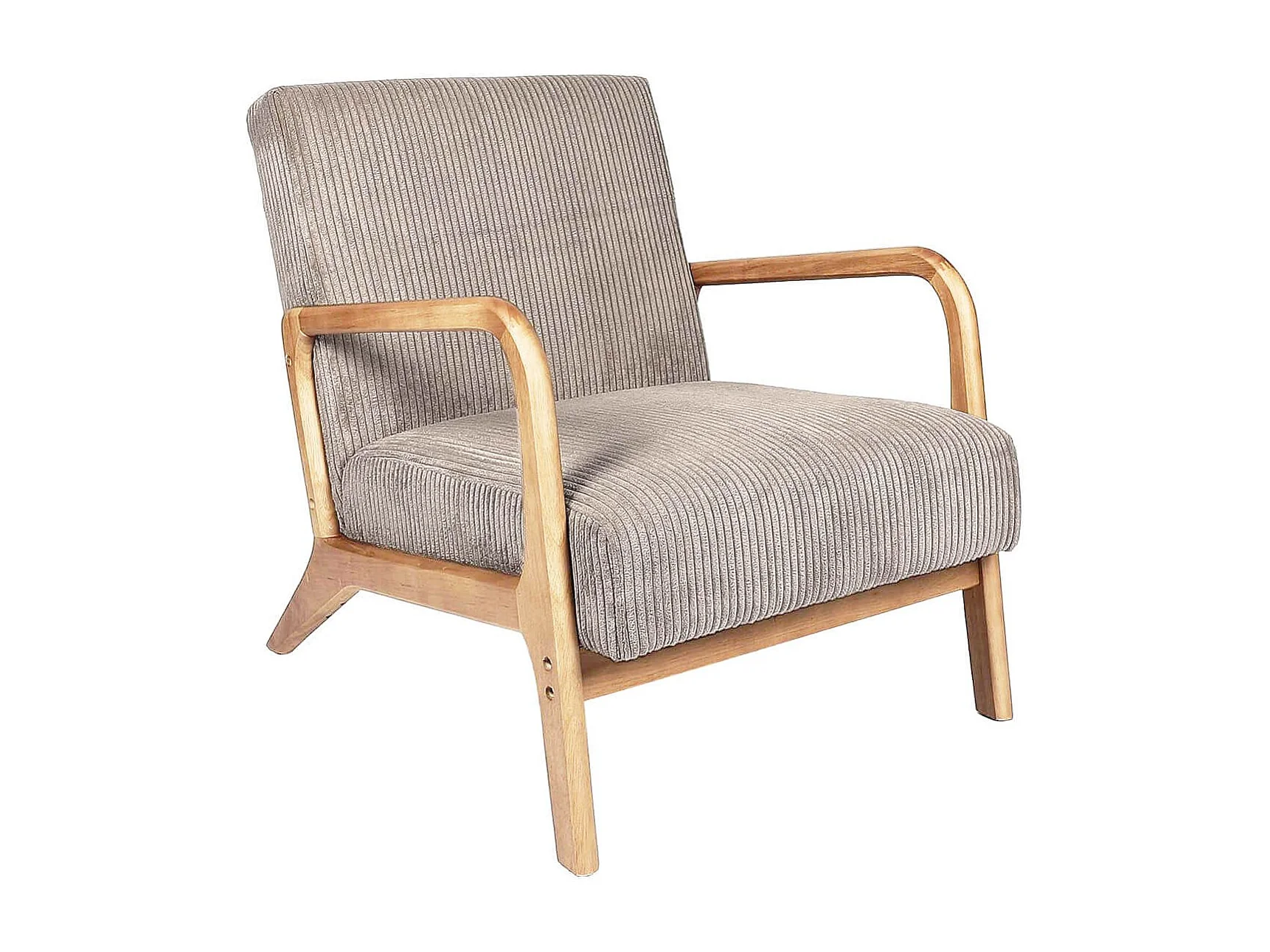 AMORY - Fauteuil en velours côtelé coloris taupe pieds et accoudoirs en hévéa