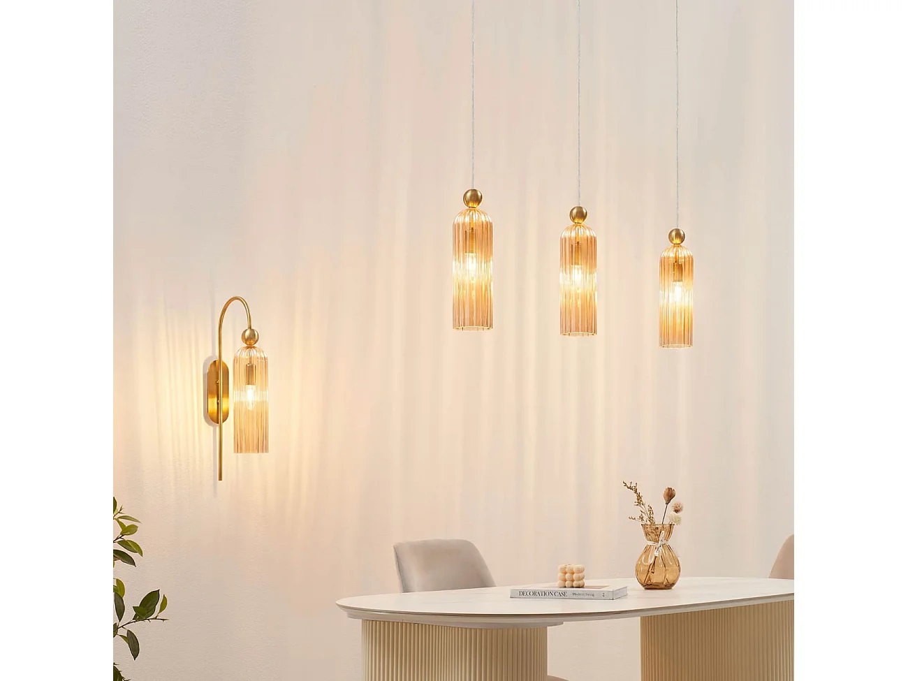 Lustre en métal et verre fumé 4 globes - L. 48 x H. 140 cm - Doré et gris fumé - GALRON
