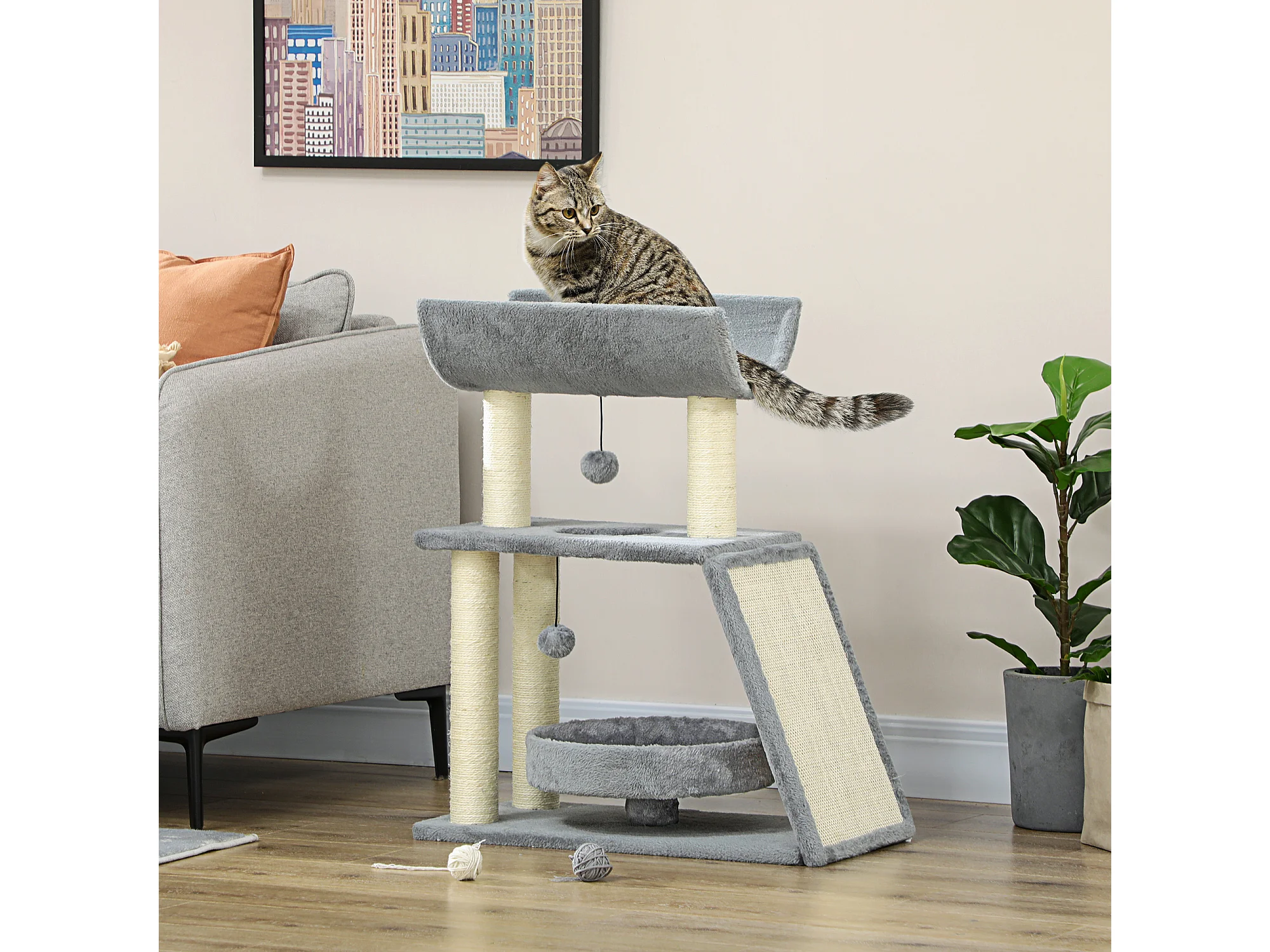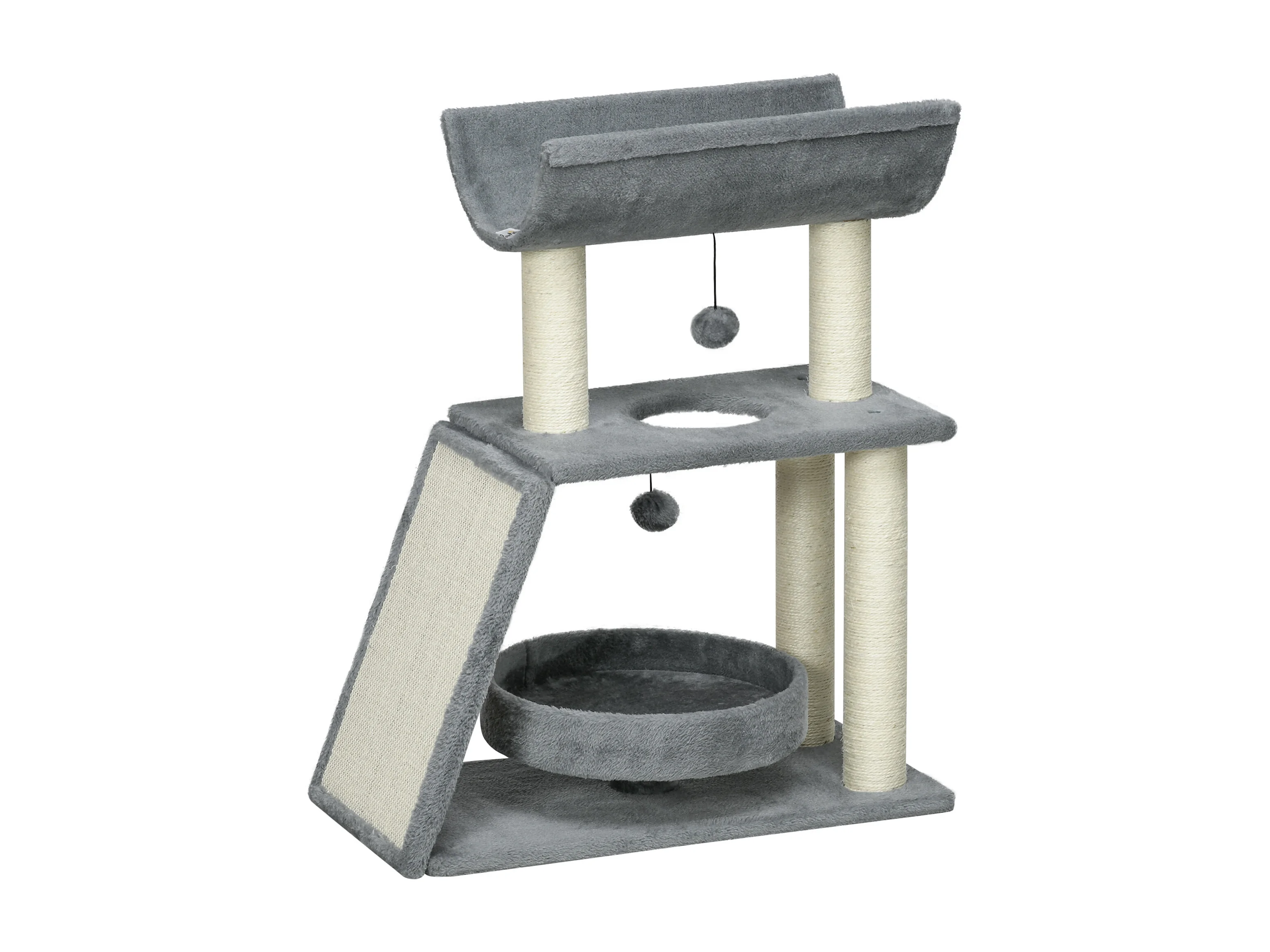 Arbre à chat H.87 cm 3 niv. - griffoirs, niche, bande massante, tour observation, boules - gris clair