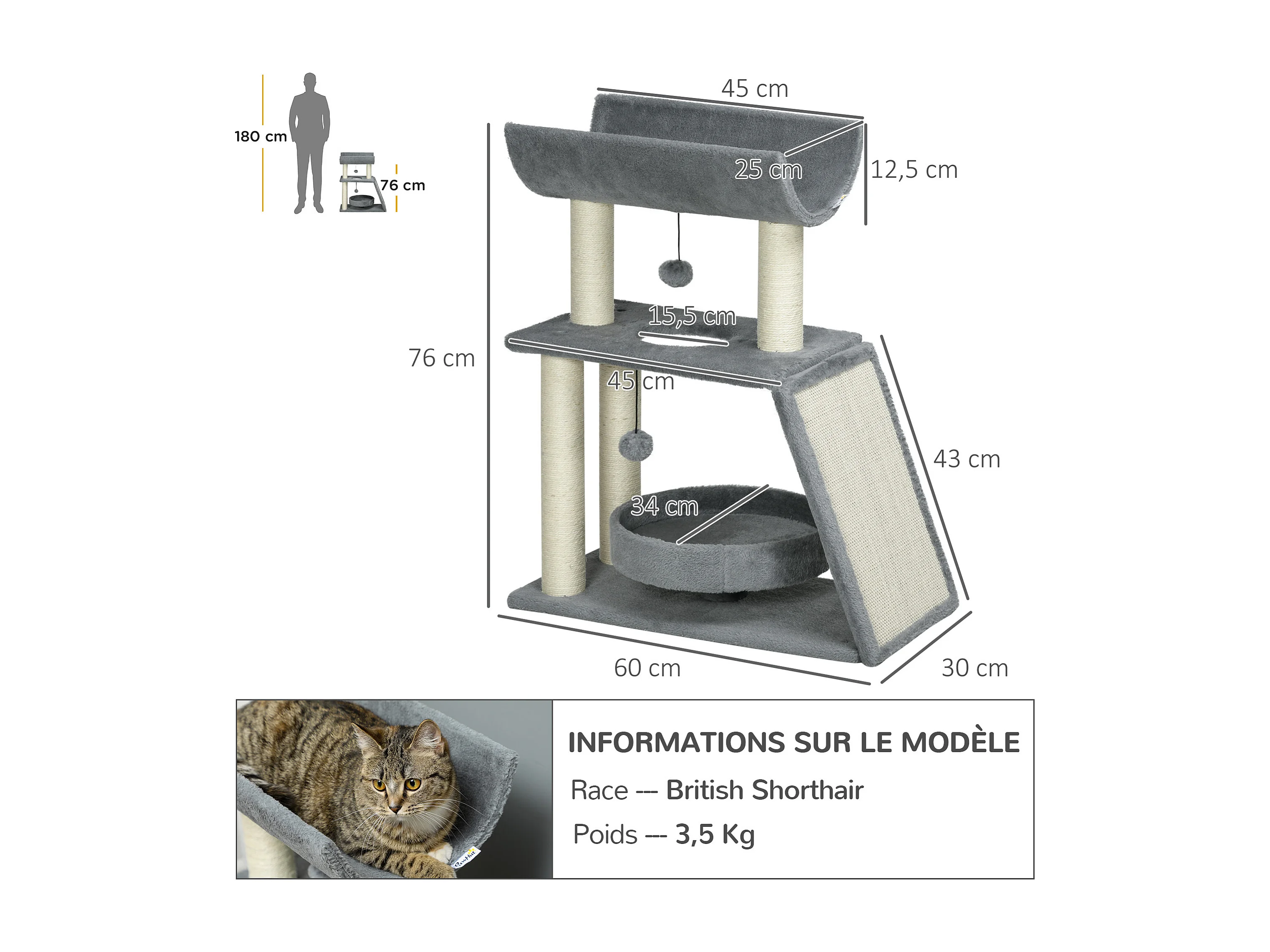 Arbre à chat griffoirs sisal naturel niche plateformes panier hamac jeux boules suspendues peluche gris