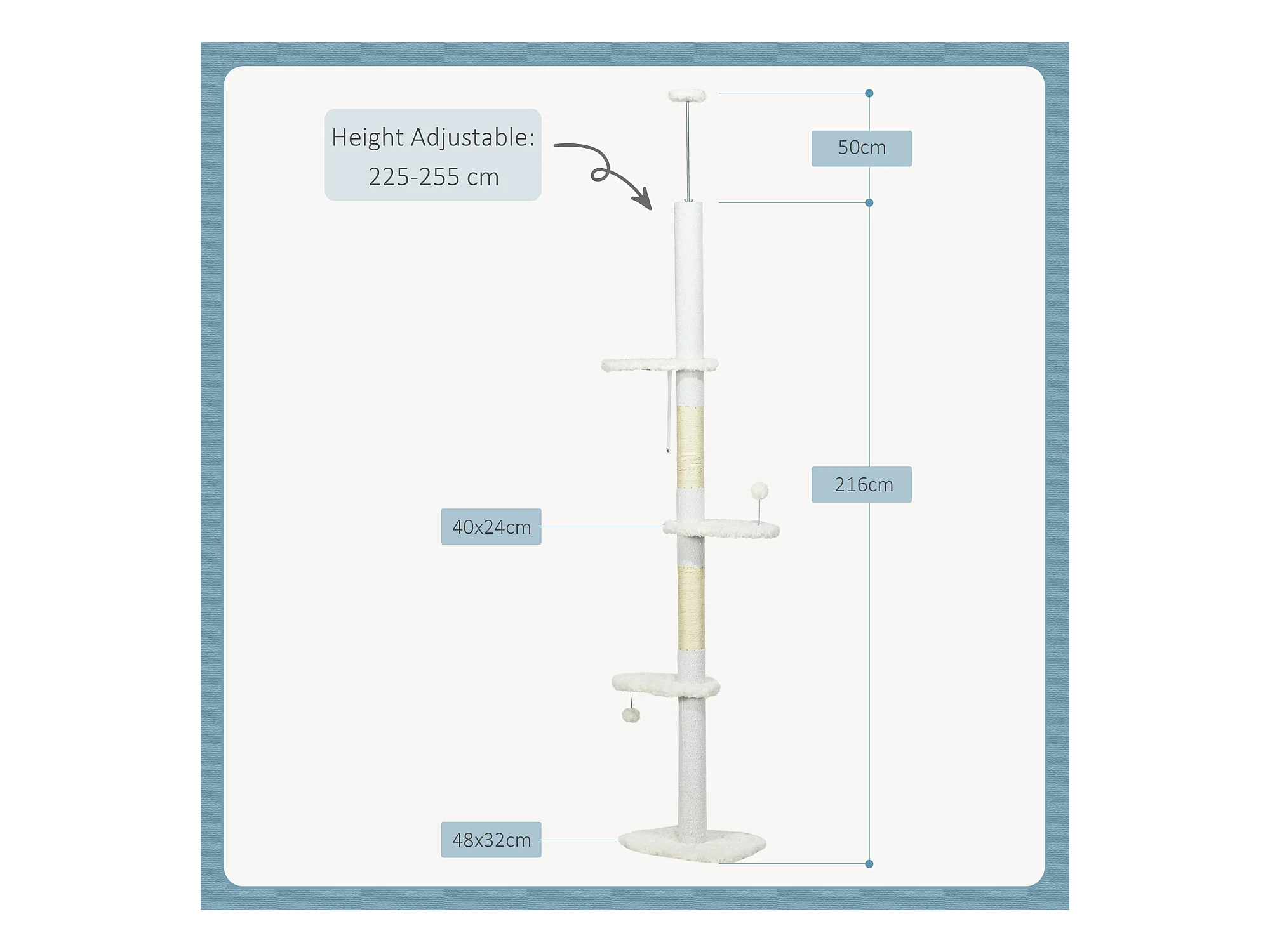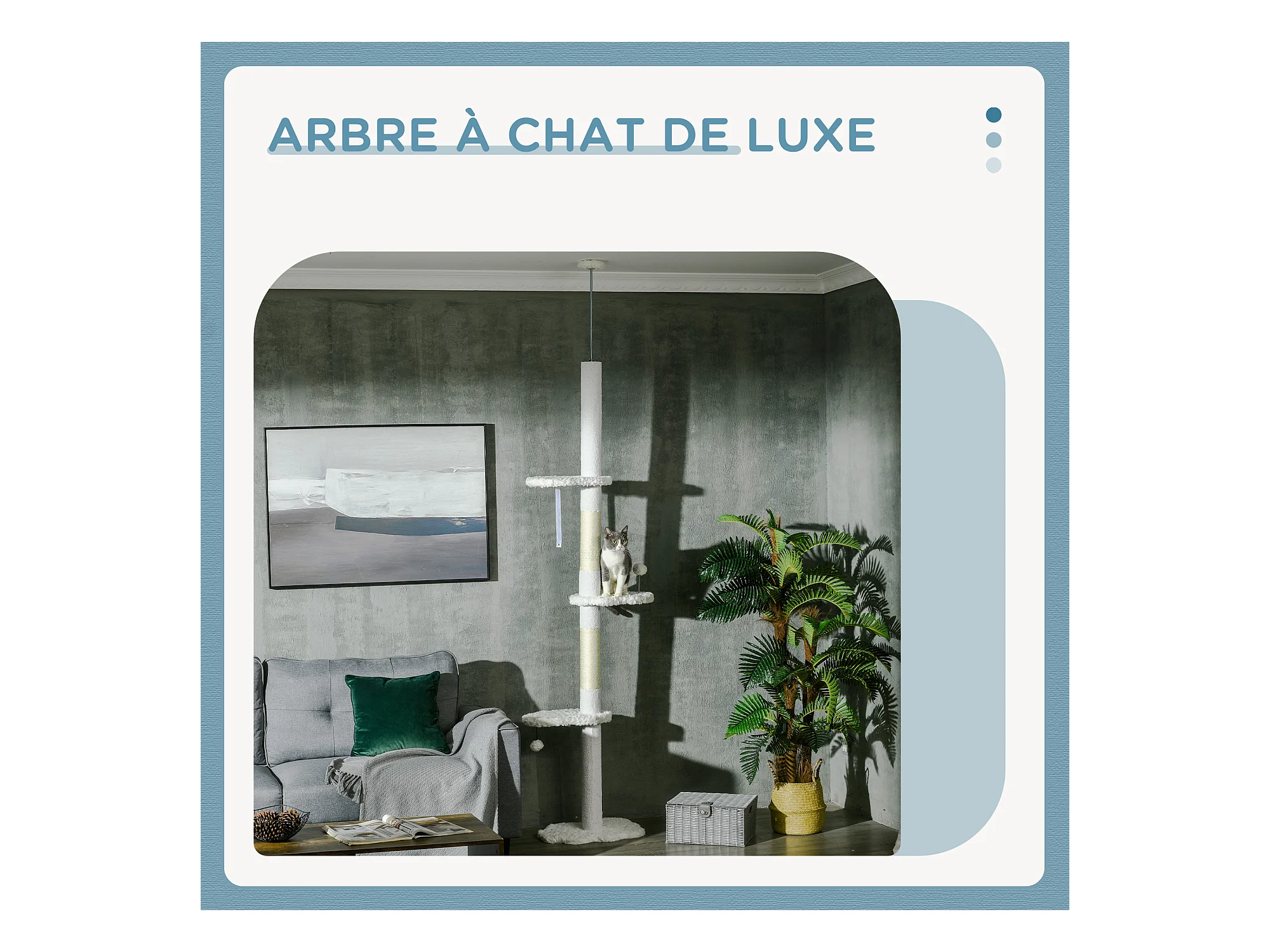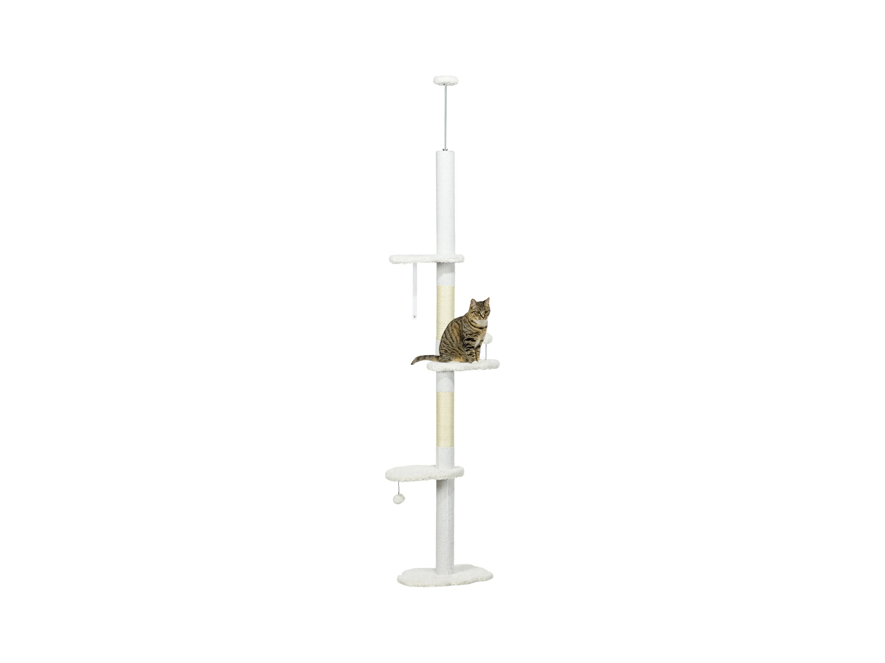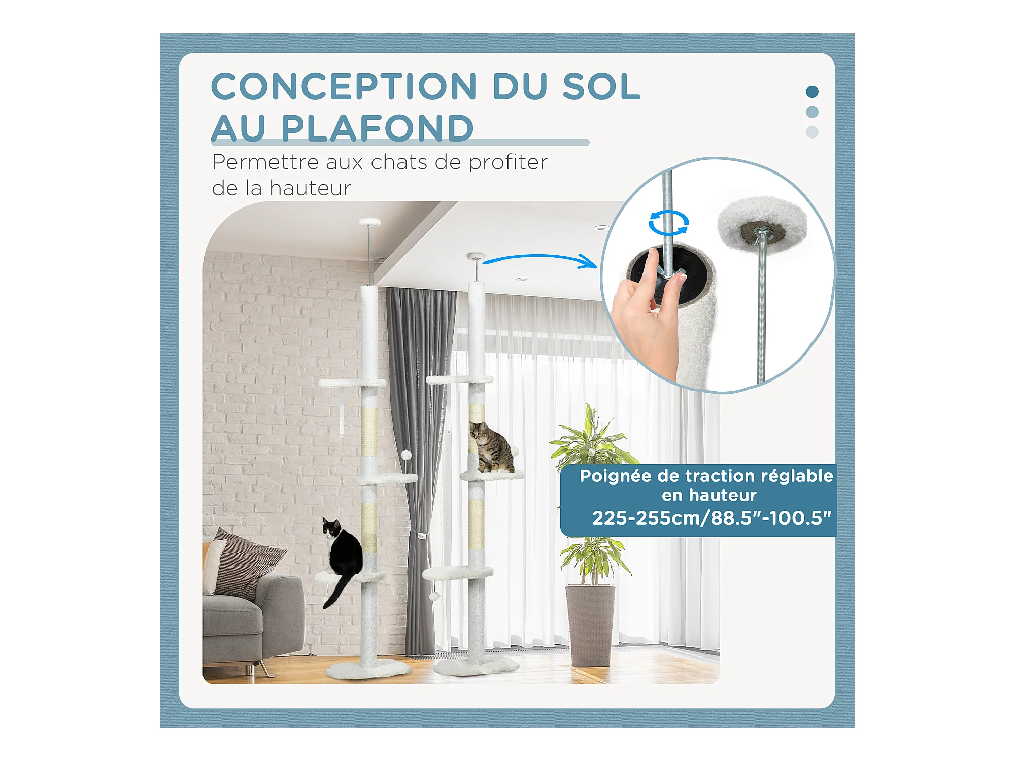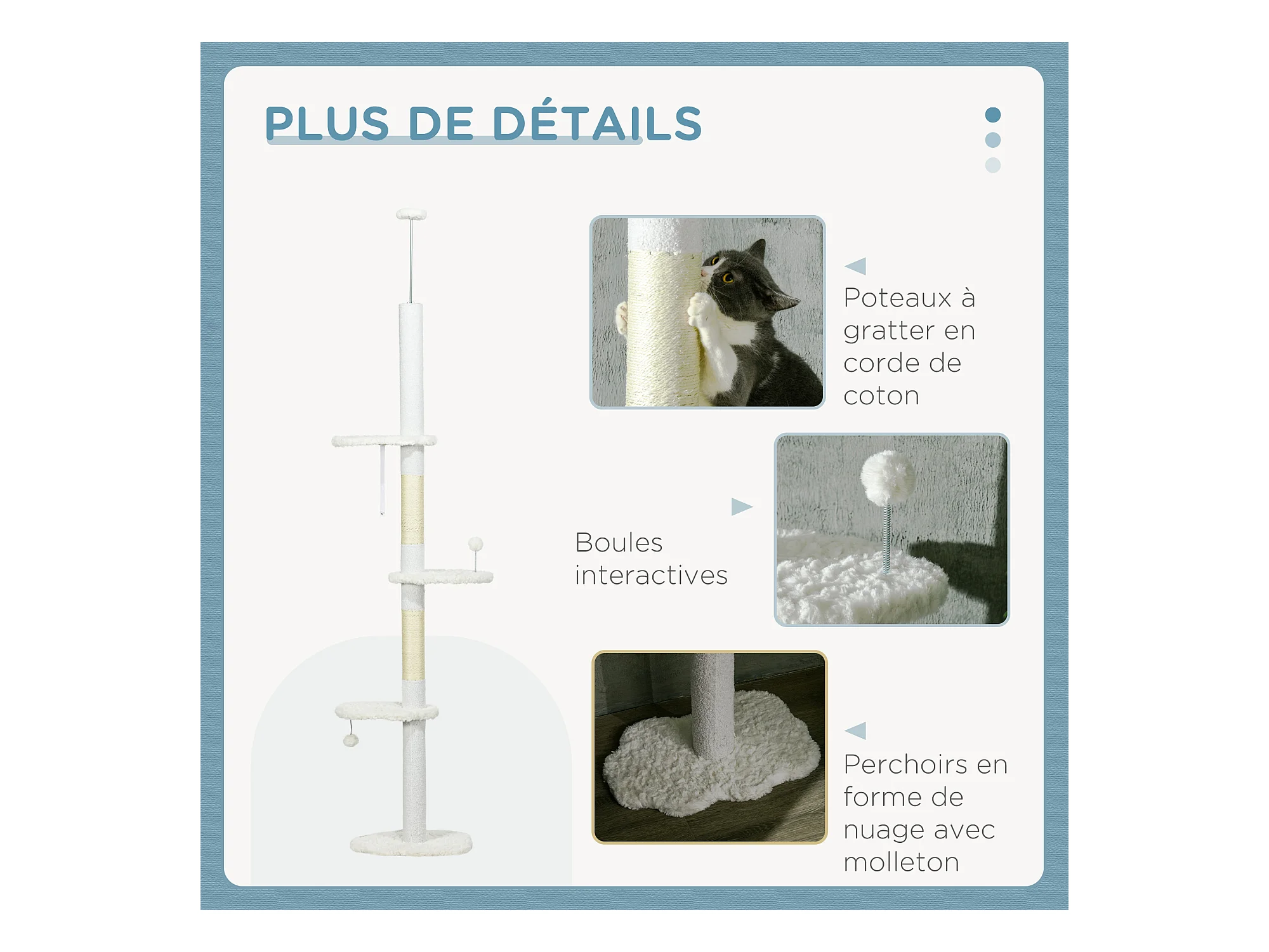 Arbre à chat réglable en hauteur 225-255 cm - tour pour chat 3 griffoirs nuages, 2 balles - blanc