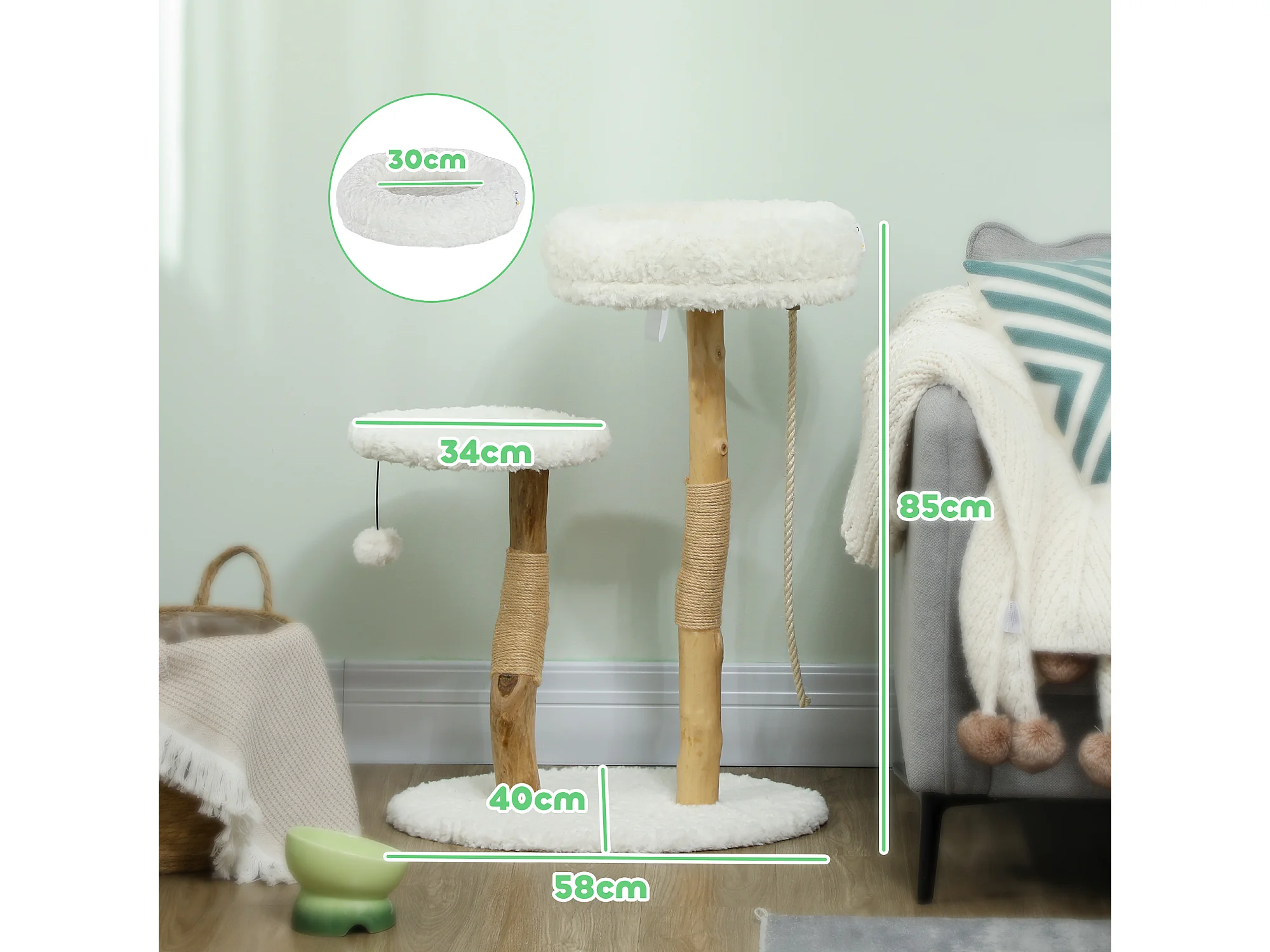 Arbre à chat 2 griffoirs jute naturelle panier jeu 2 boules suspendues avec clochettes peluche blanche
