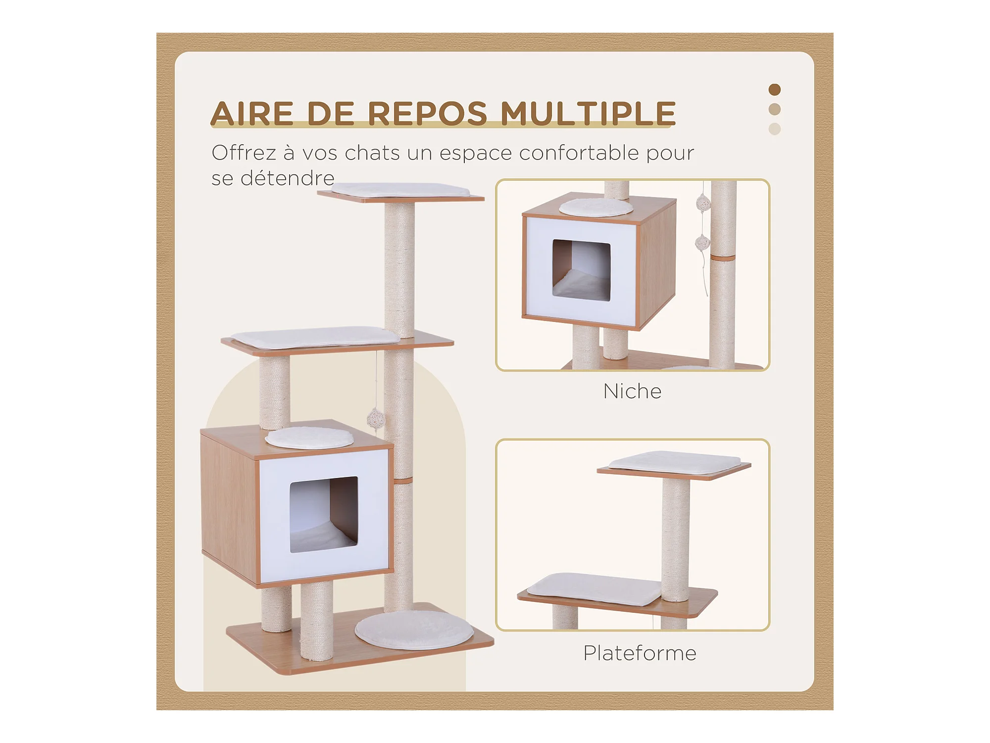 Arbre à chat style cosy chic griffoir sisal niche plateforme d'observation boule jacinthe d'eau peluche aspect fourrure