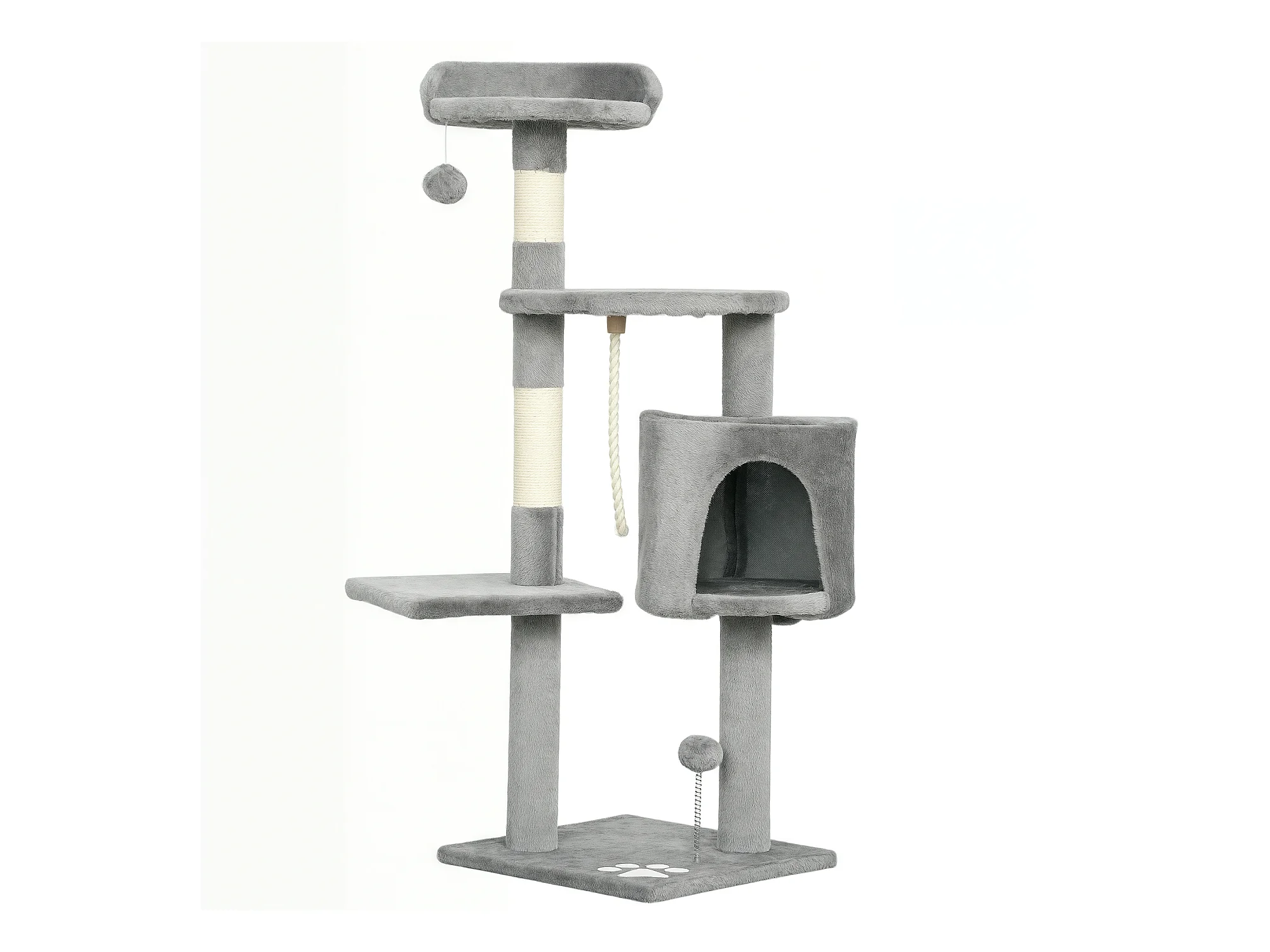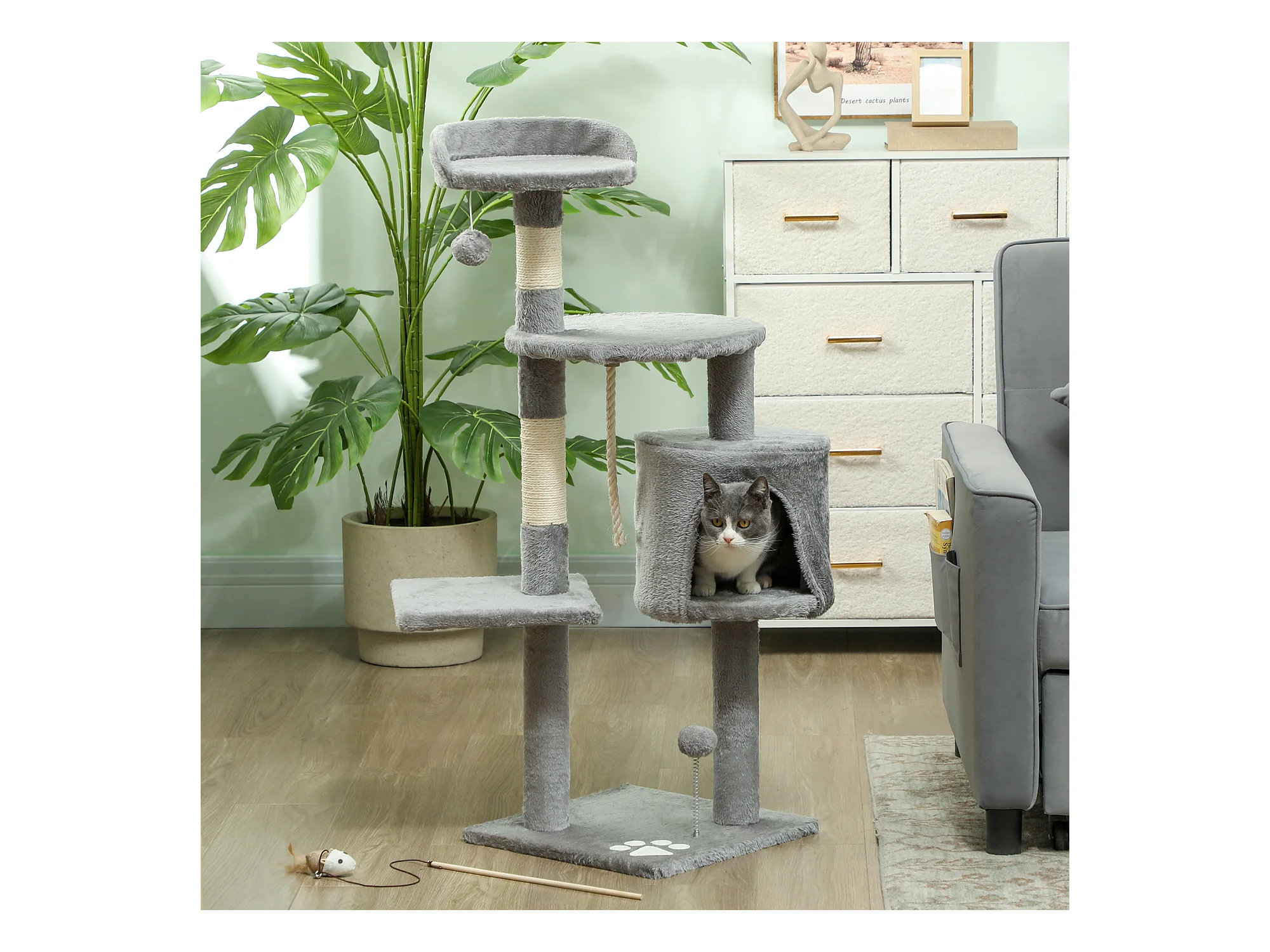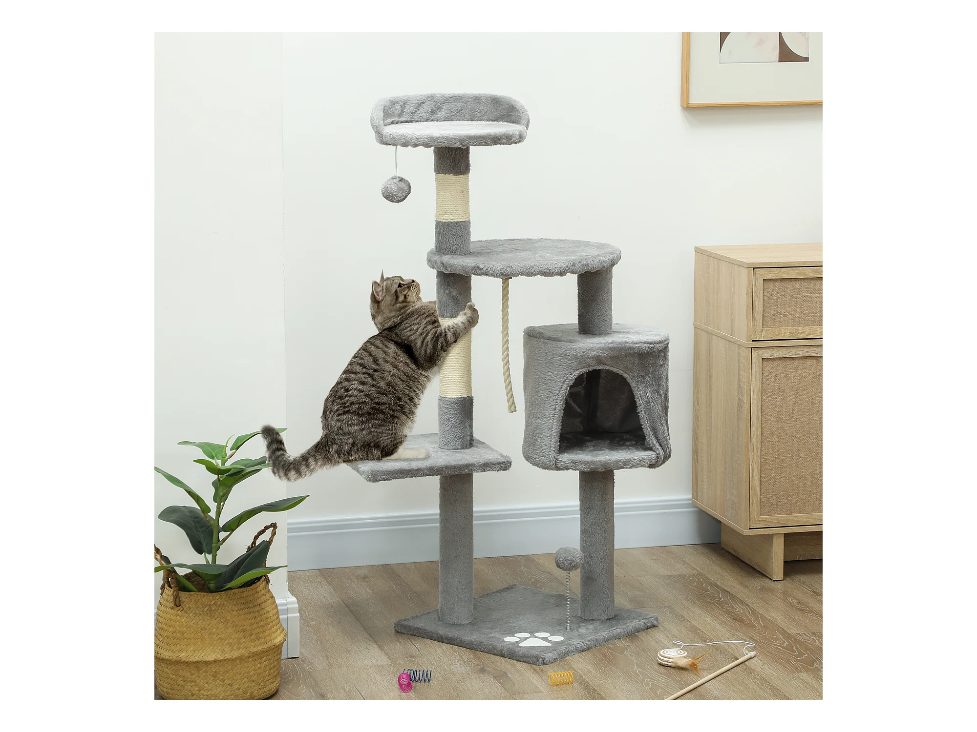 PawHut Arbre à Chats avec Griffoir Niche Poteaux Peluche Haute Densité 45L x 40L x 148H cm Gris