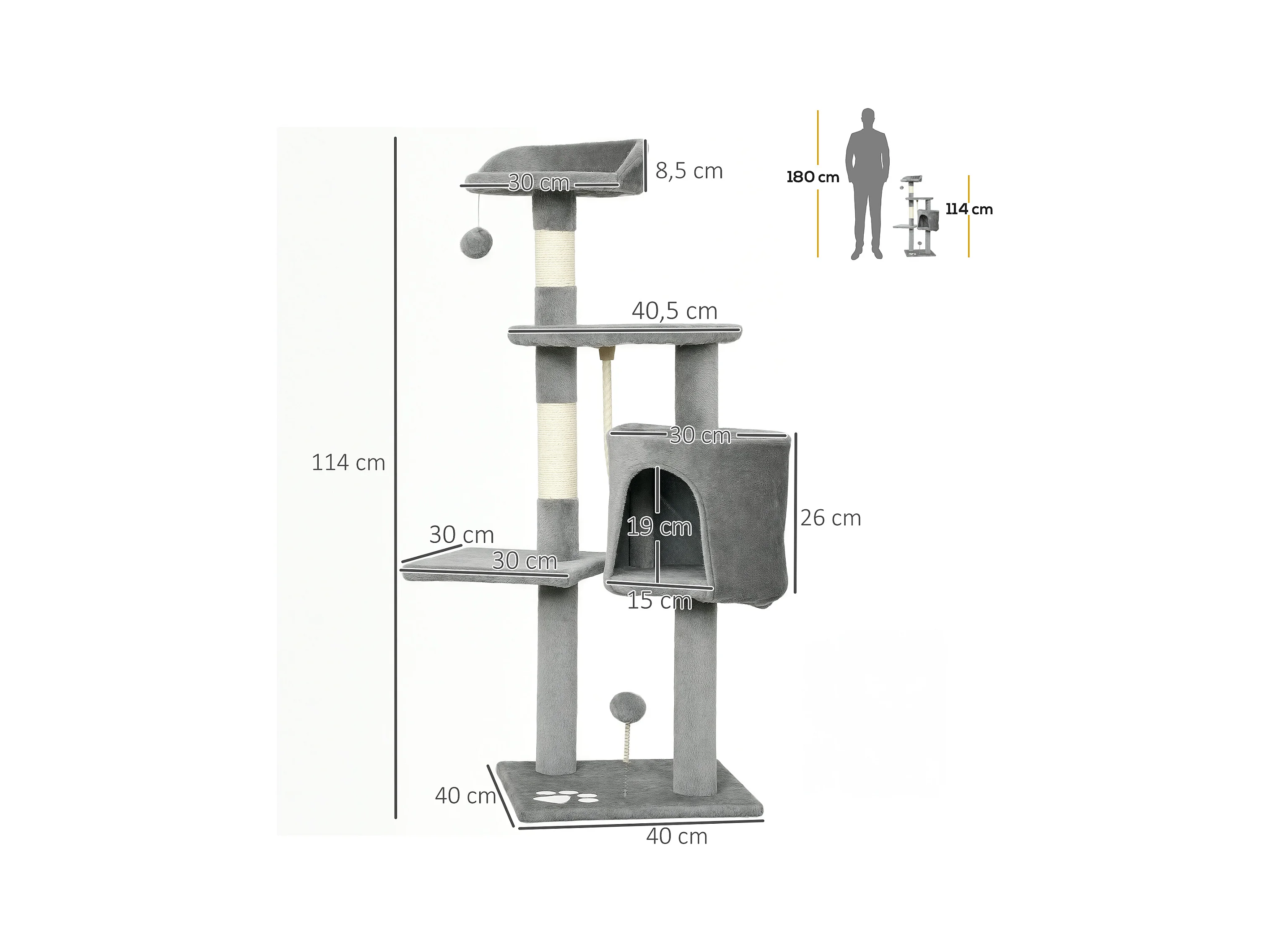 Arbre à chats multi-équipements griffoirs grattoirs plateformes niche corde jouets 40L x 40l x 114H cm gris