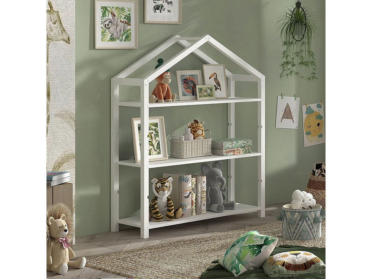 ARKAN - Bibliothèque Cabane en Pin Massif laqué Blanc 3 Niveaux