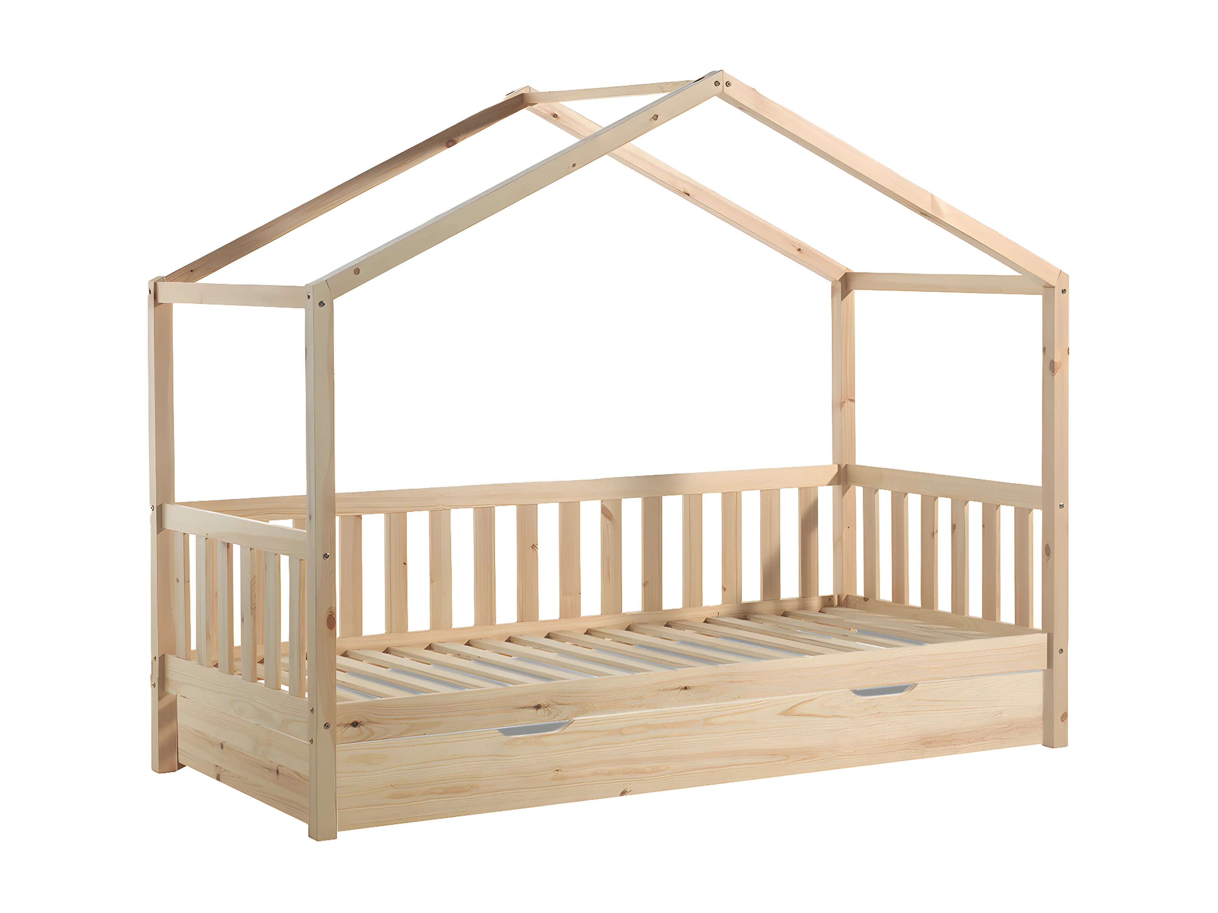 ARKAN - Lit Maison à Barrières 90x200cm Pin Naturel + Tiroir