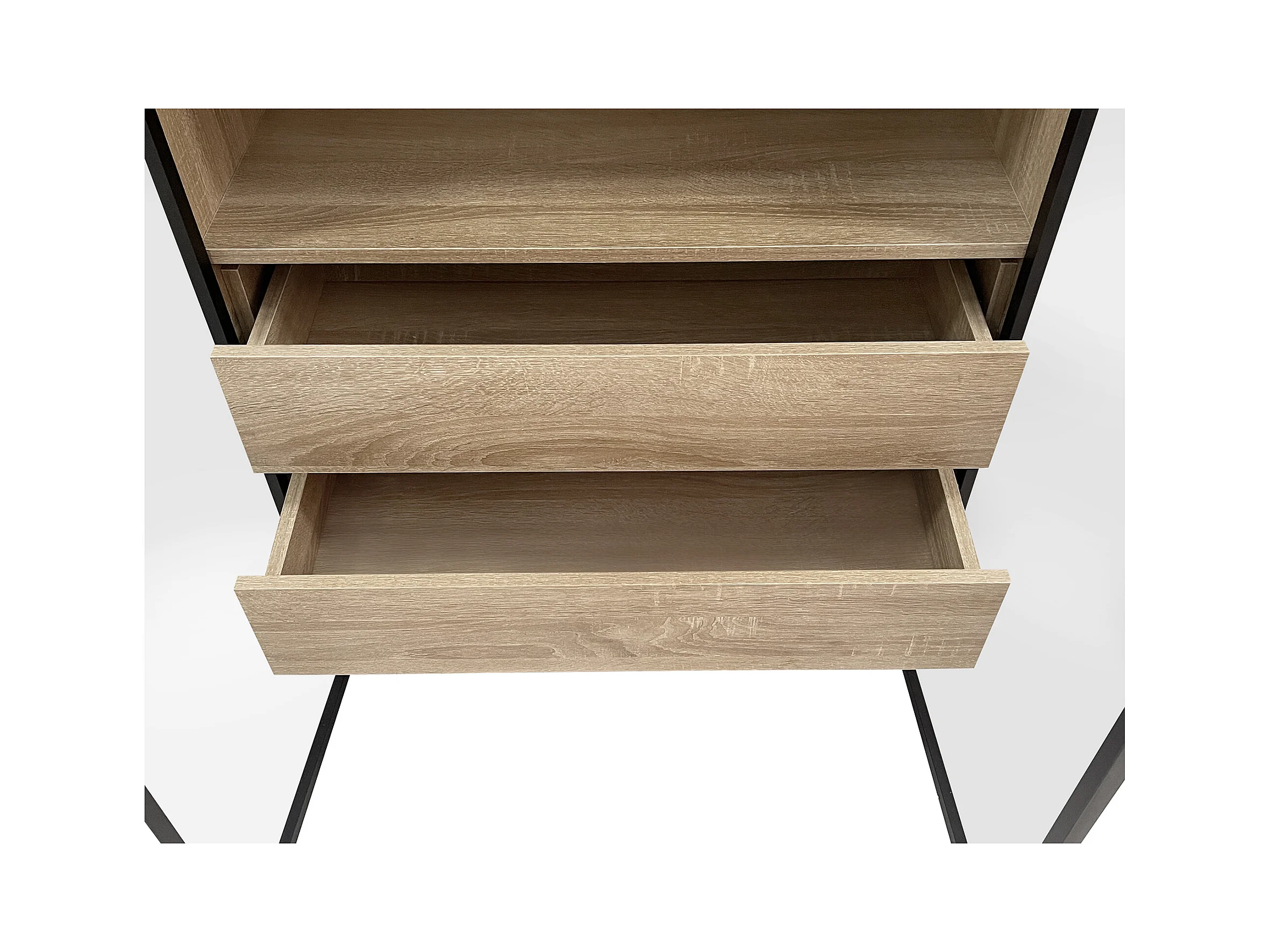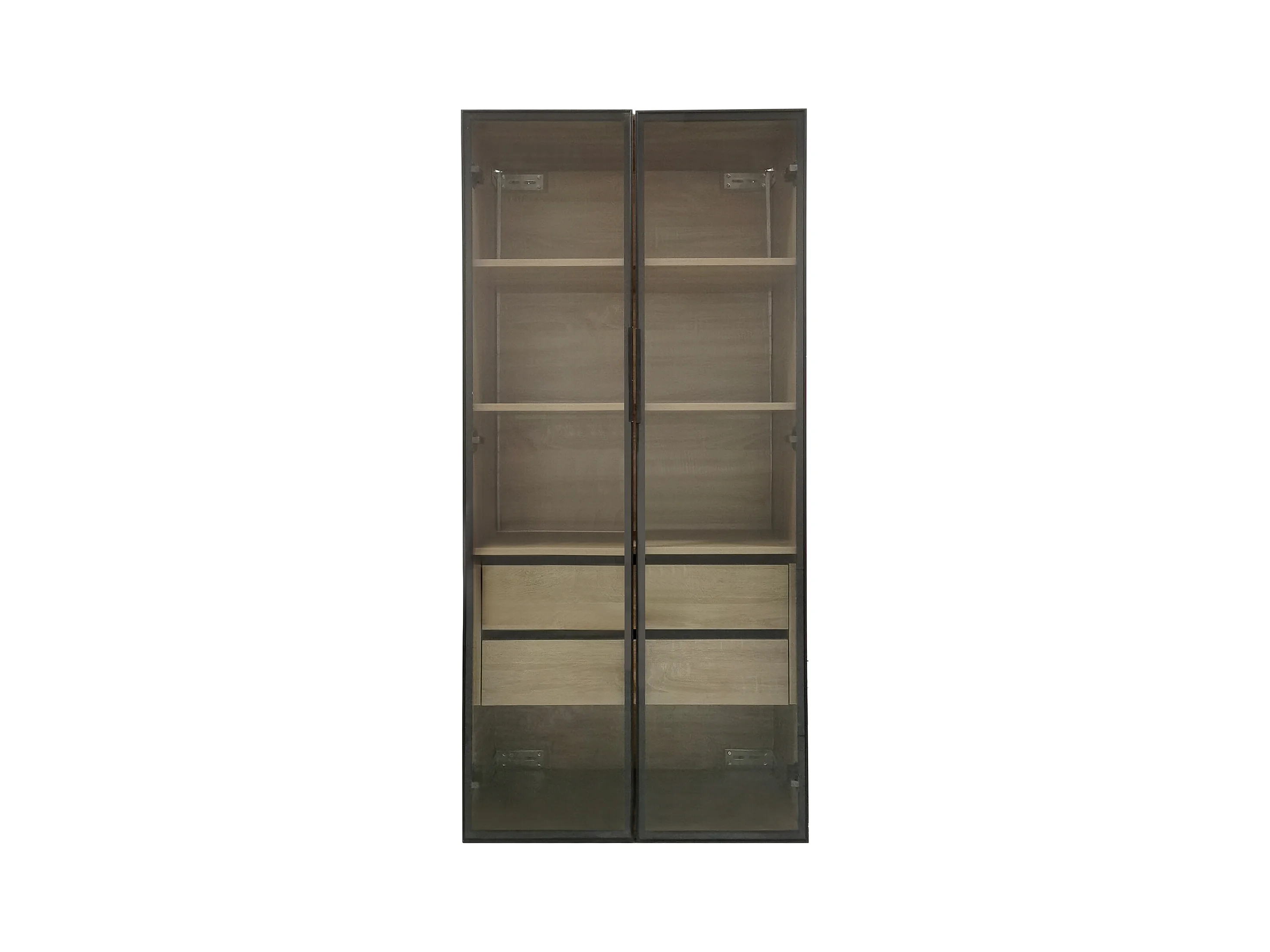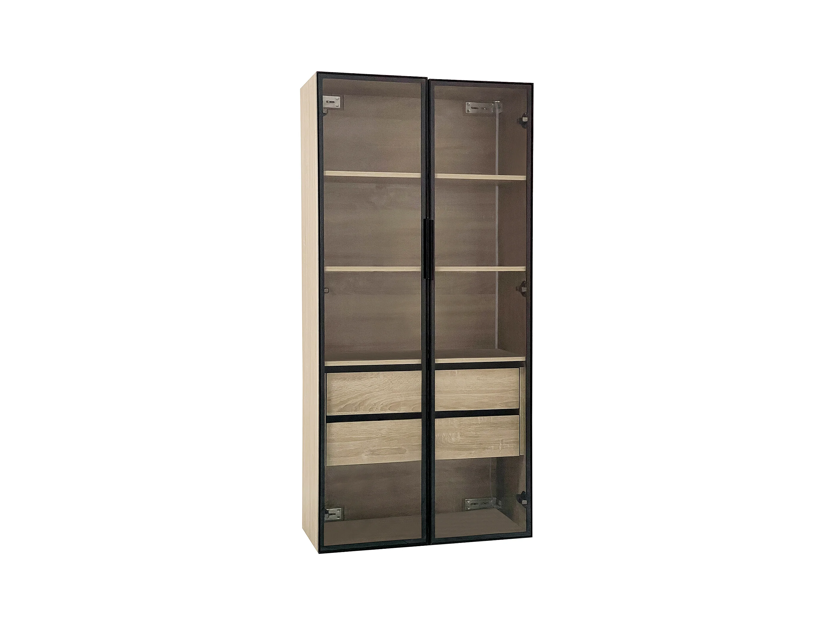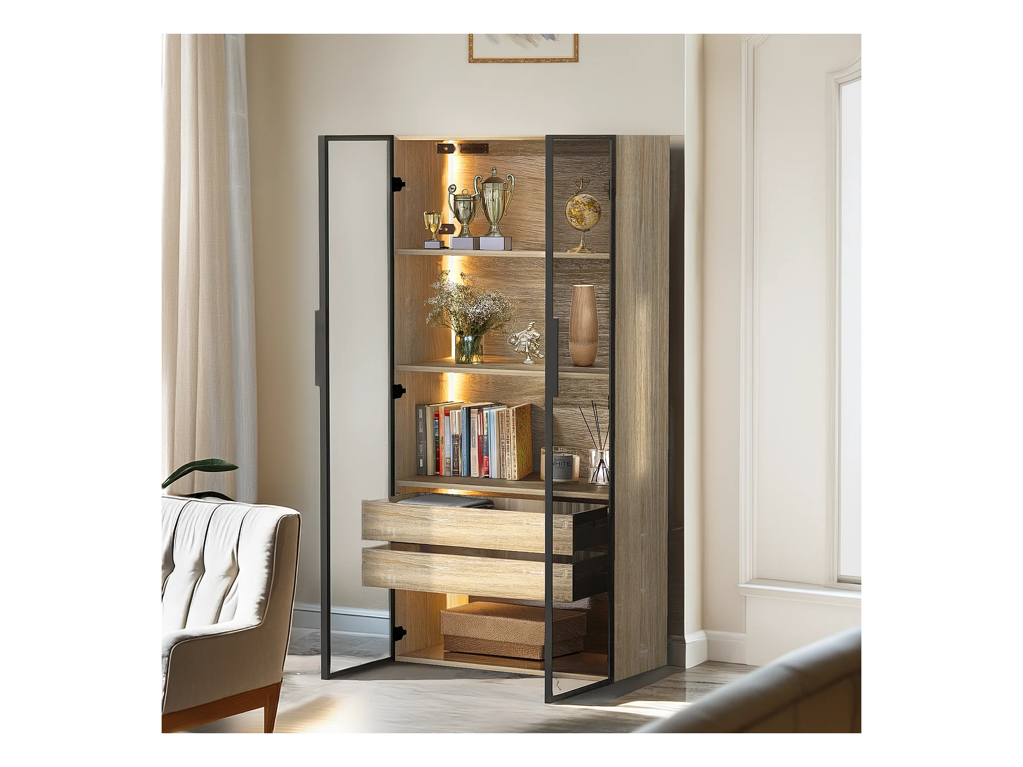 Armoir de salle de bain avec 2 portes en verre et 2 tiroirs cachés, LED inclus, corps en MDF naturel clair - 74x36x155cm