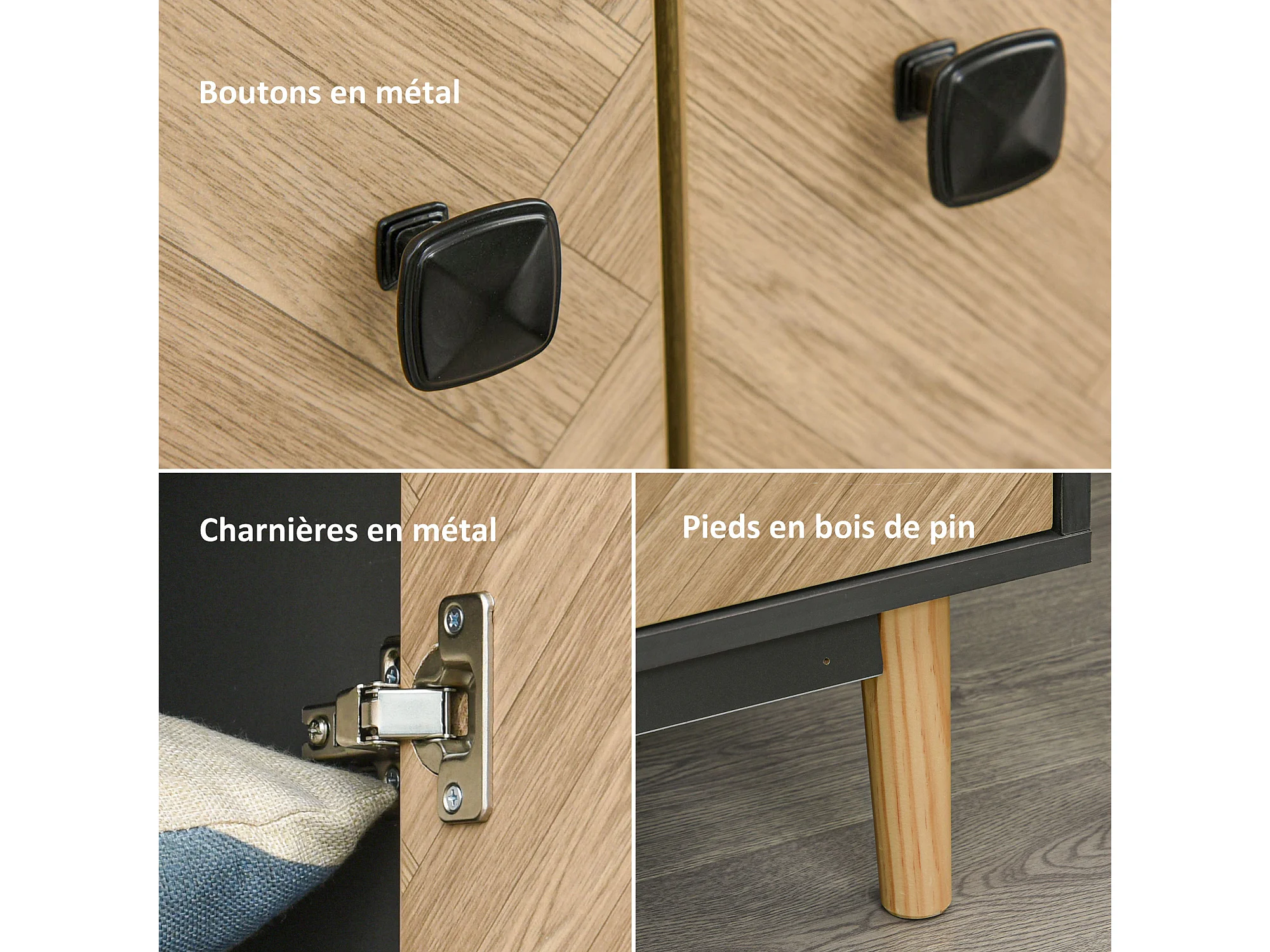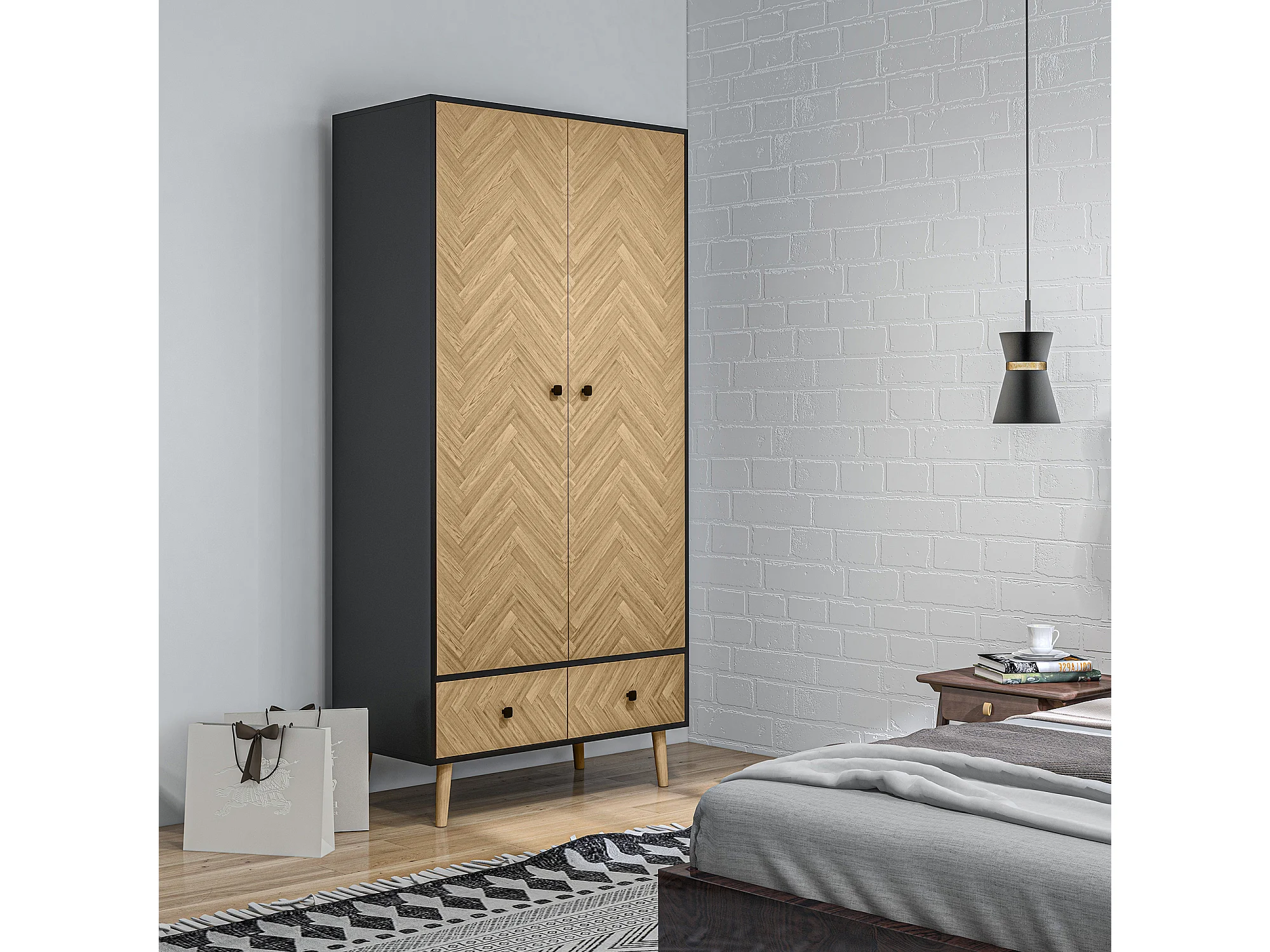 Armoire 2 portes 2 tiroirs design - 2 barres penderie, 2 niches - façades motif chevrons- gris foncé aspect bois clair
