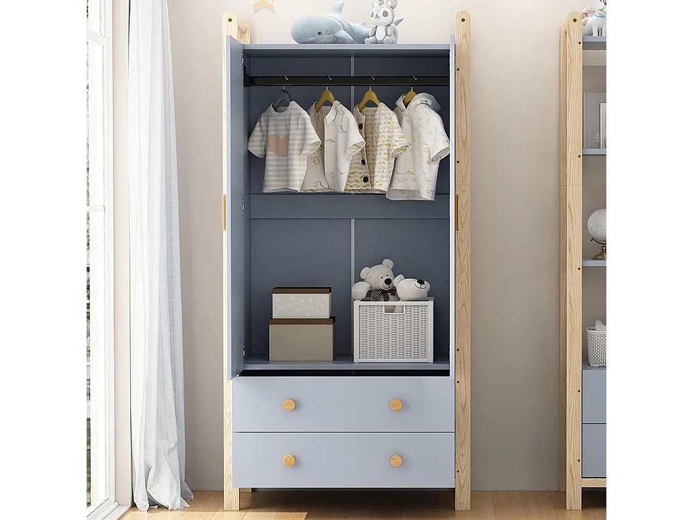 Armoire 2 portes tringle vêtements 2 tiroirs chambre salon vestiaire aggloméré bleu pin