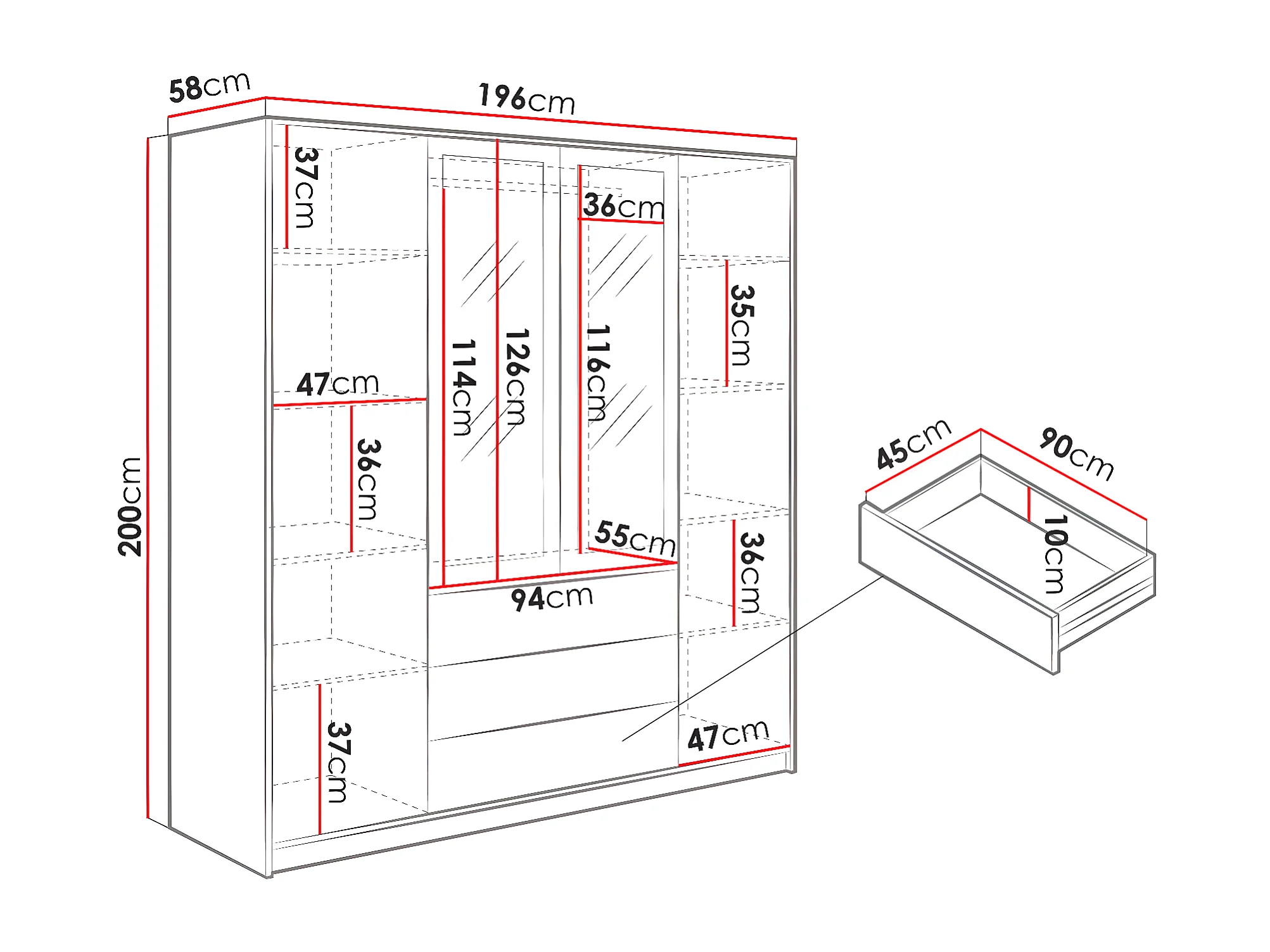 Armoire 4 portes et 3 tiroirs - Avec miroirs - L196 - Noir et doré - MONLIO