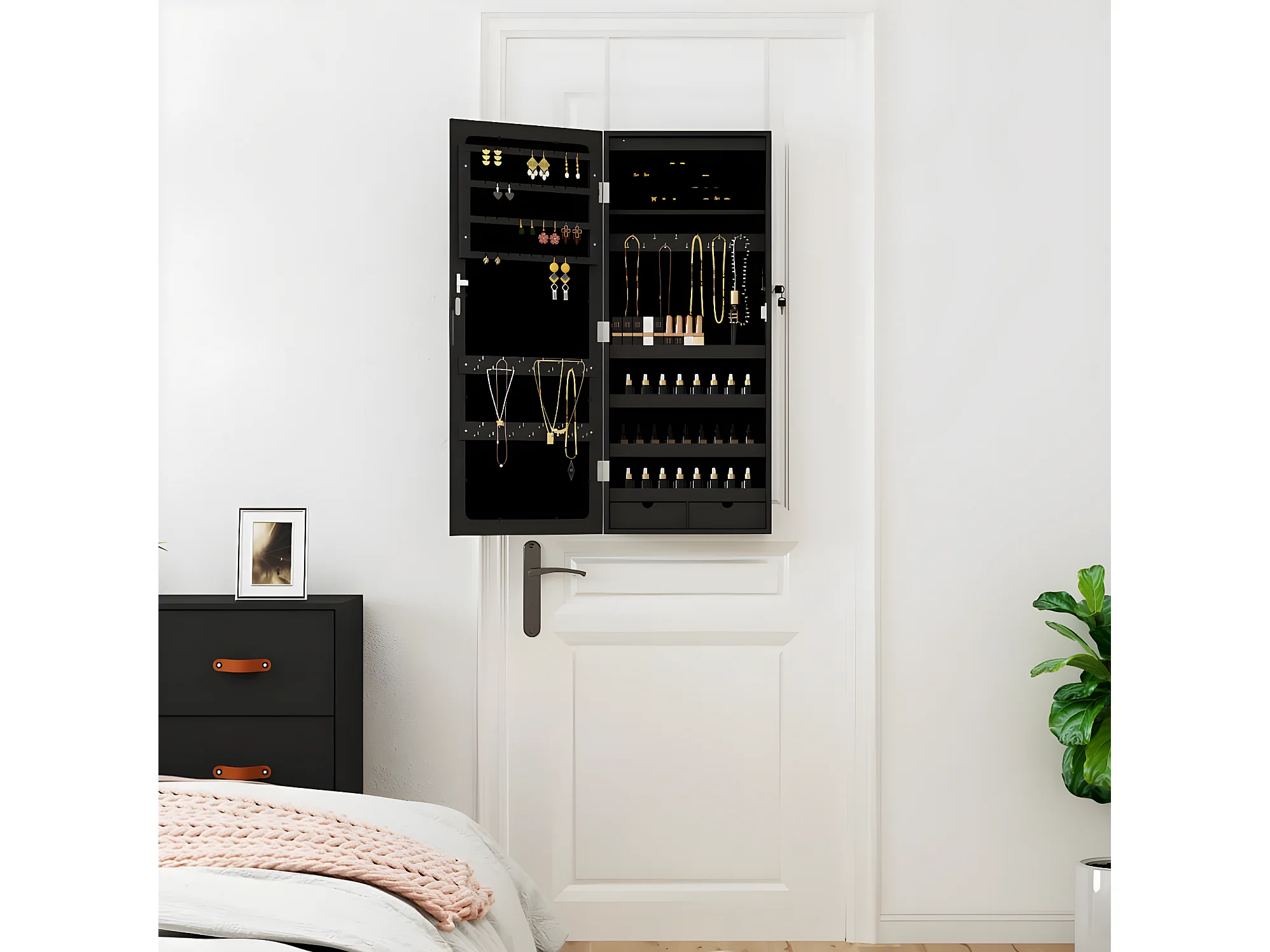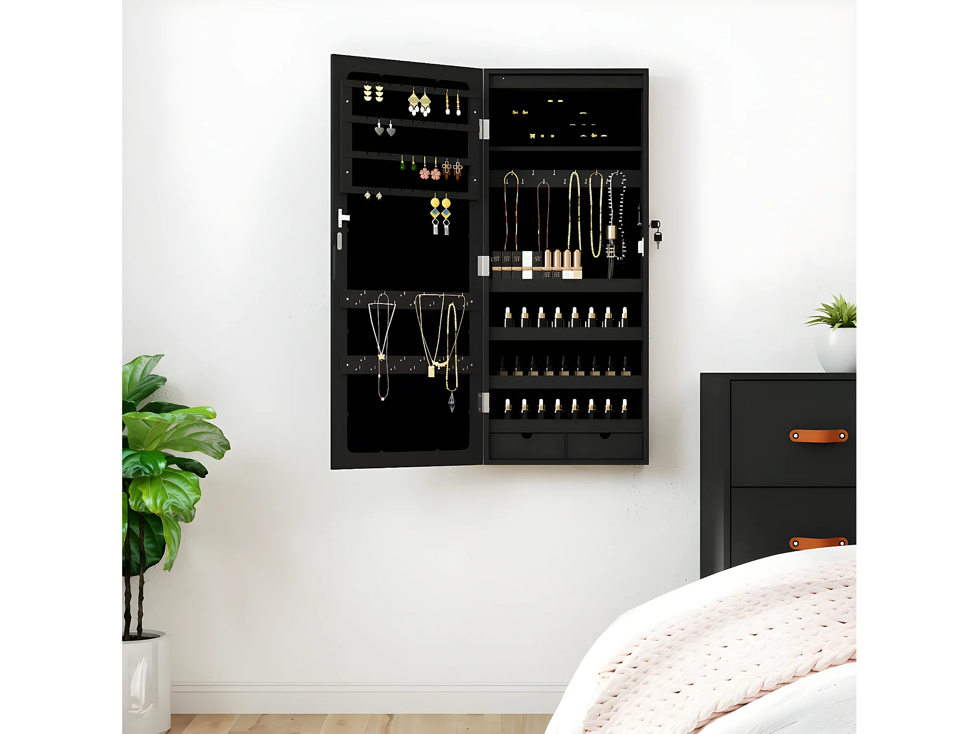 Armoire à bijoux avec miroir et éclairage LED mural noir OFR54830 BonneVie Meuble