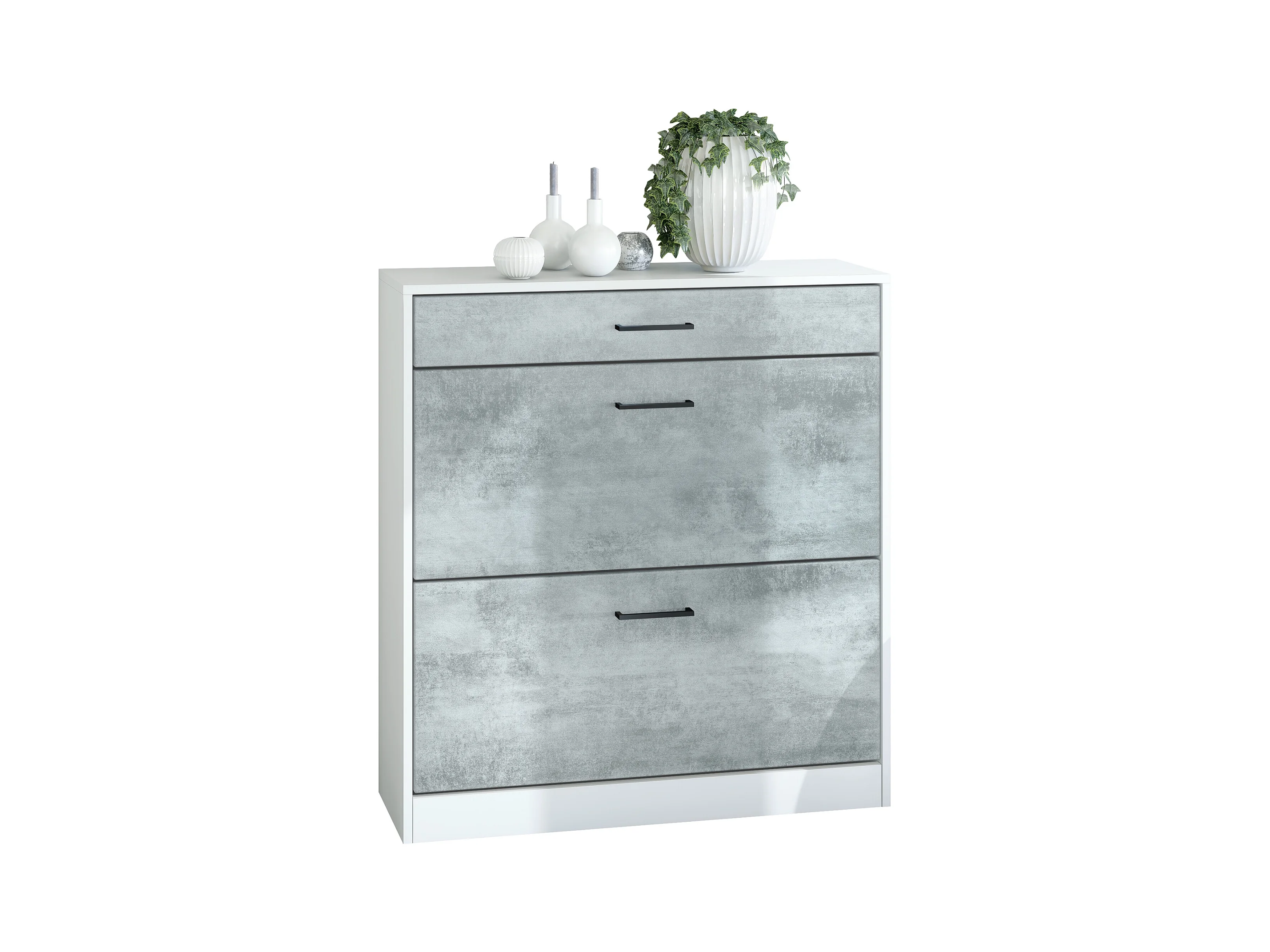 Armoire à chaussures inclinable Elvas 89 x 95,5 x 27 cm, caisson en blanc mat, façade en Aspect Béton Oxyde