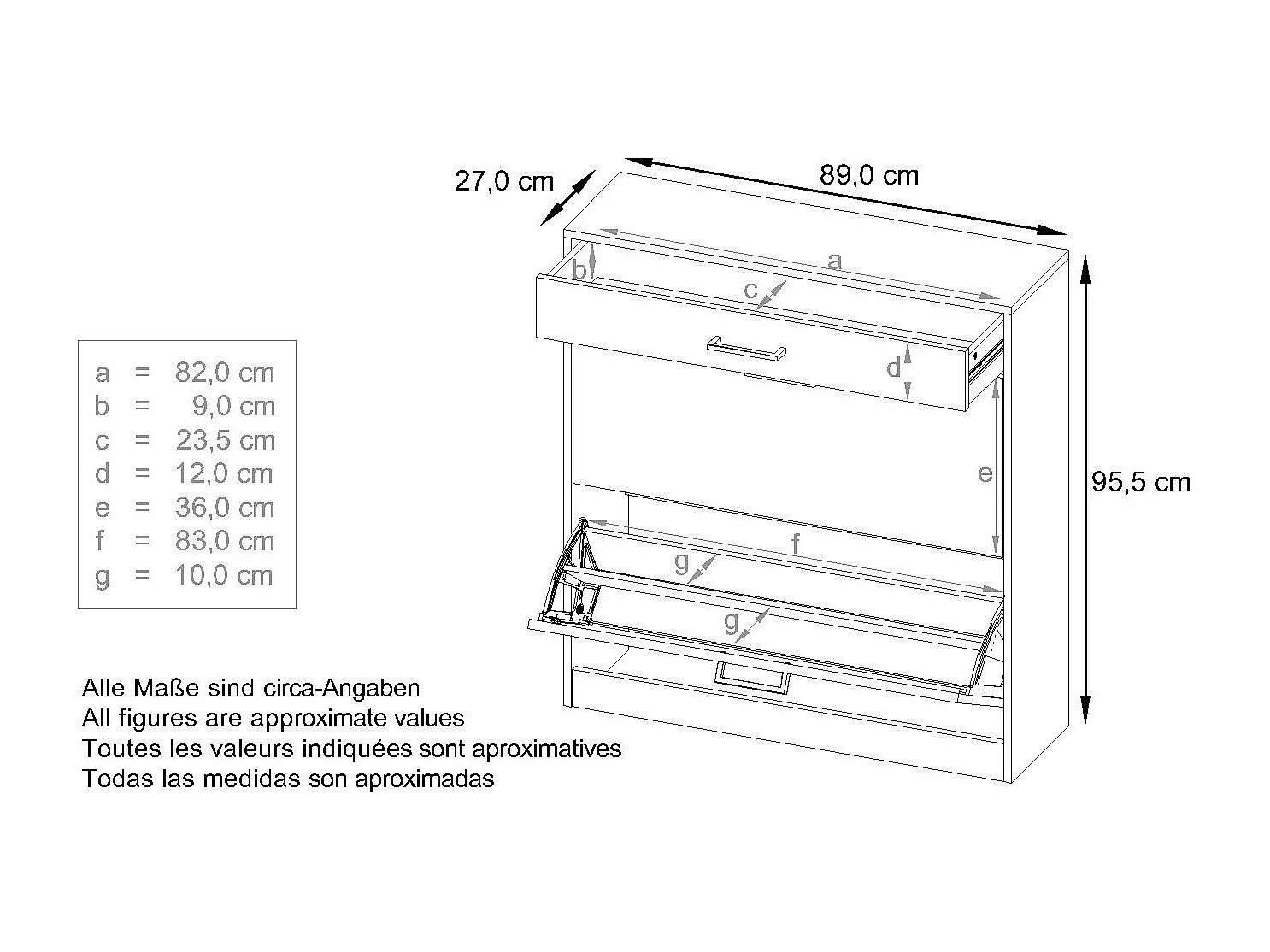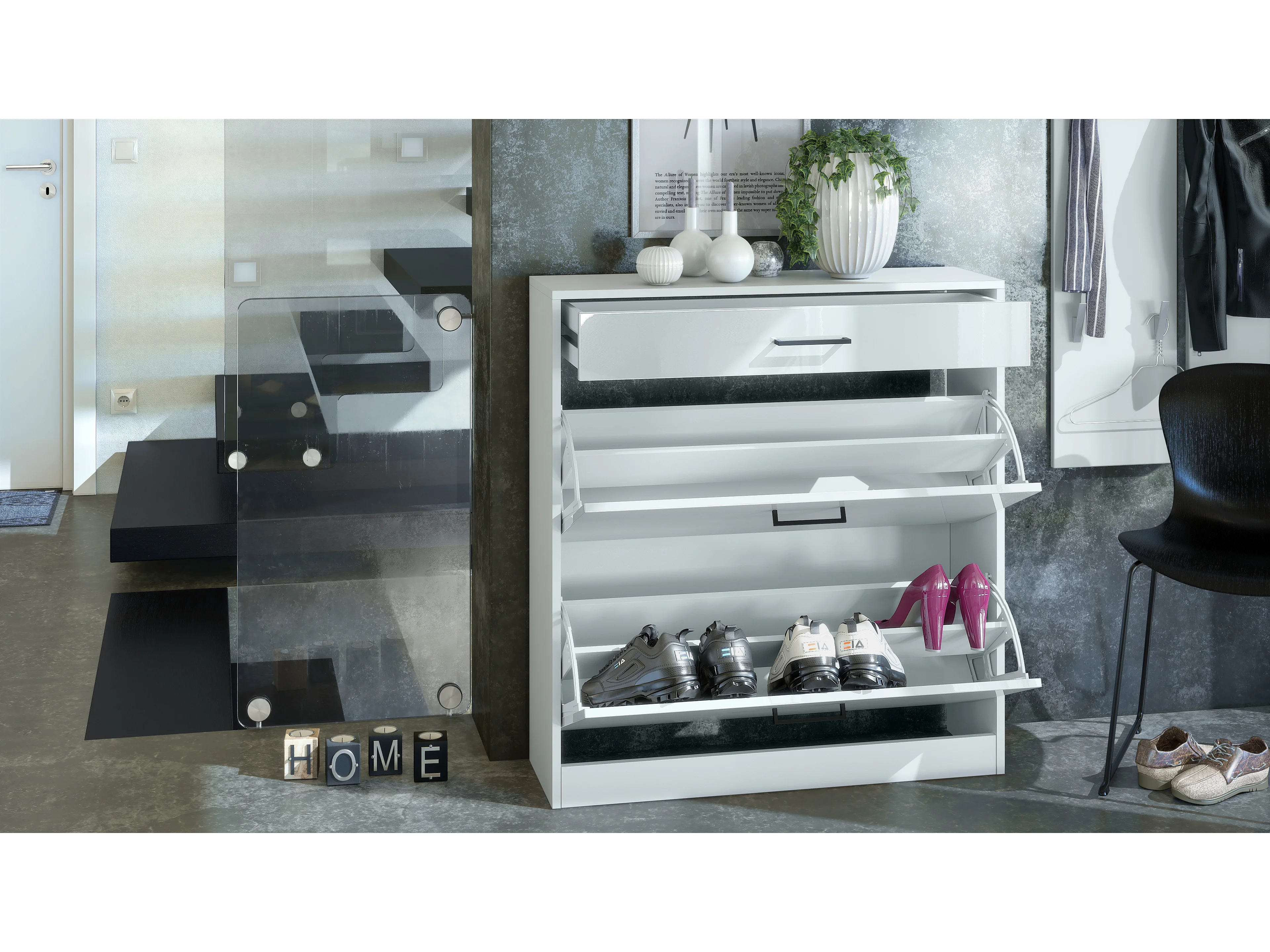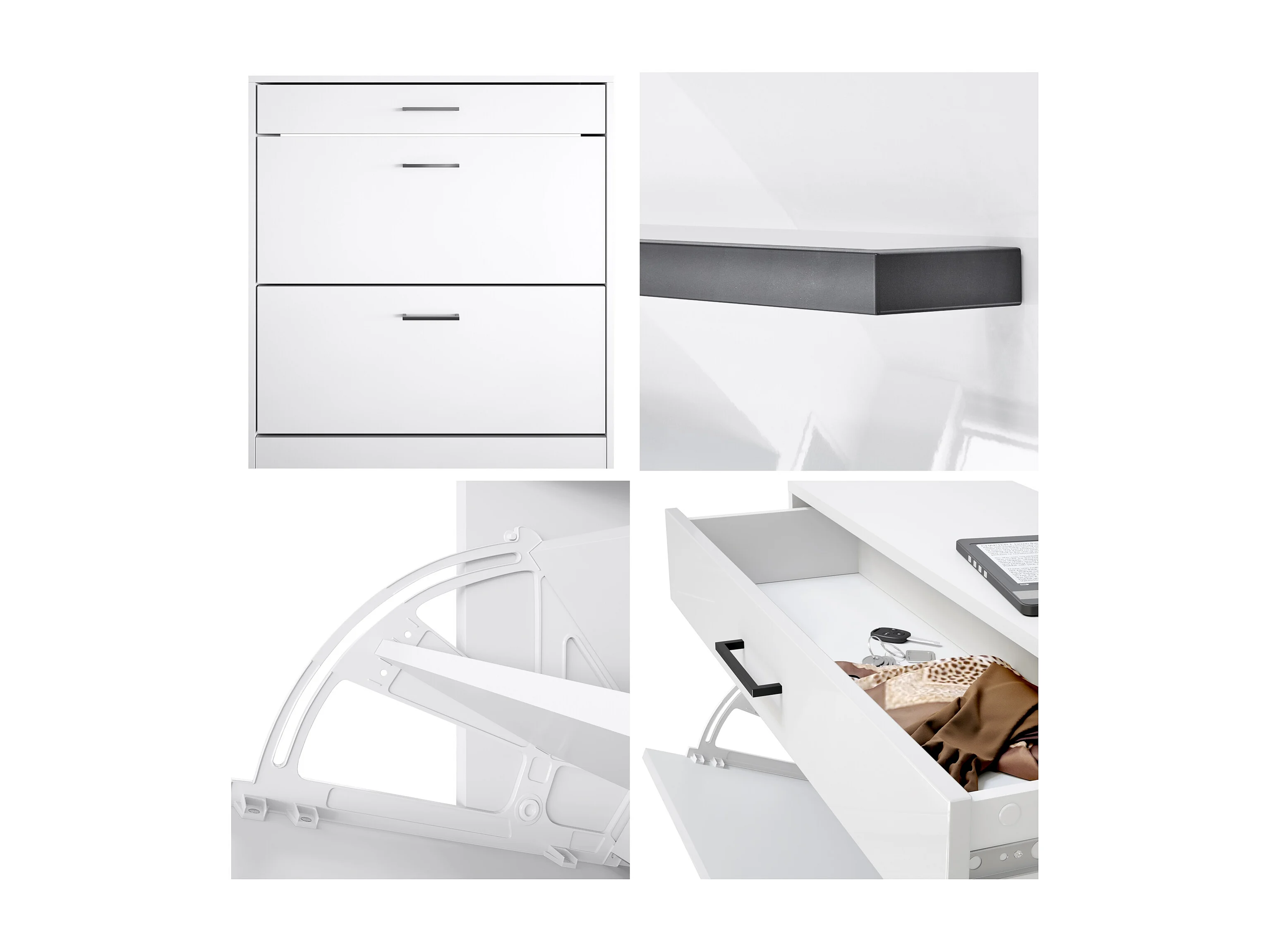 Armoire à chaussures inclinable Elvas 89 x 95,5 x 27 cm, caisson en blanc mat, façade en Blanc laqué haute brillance