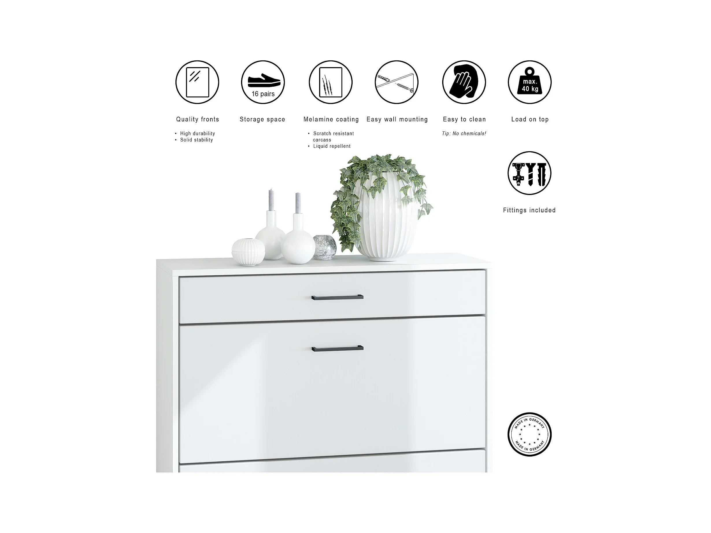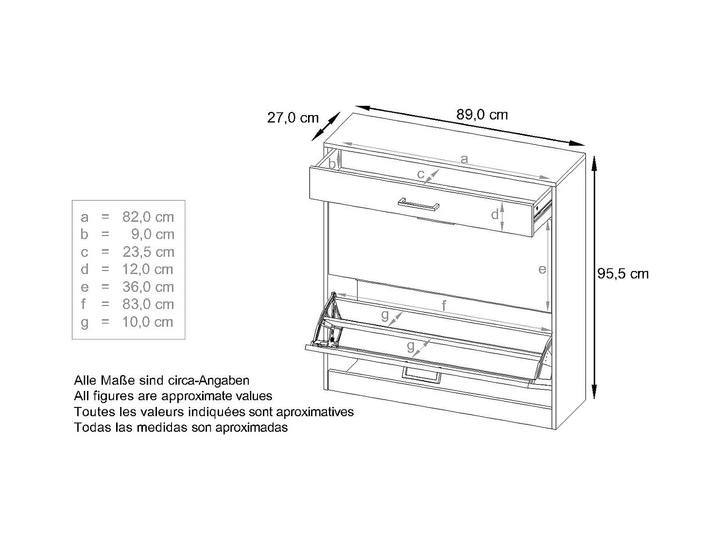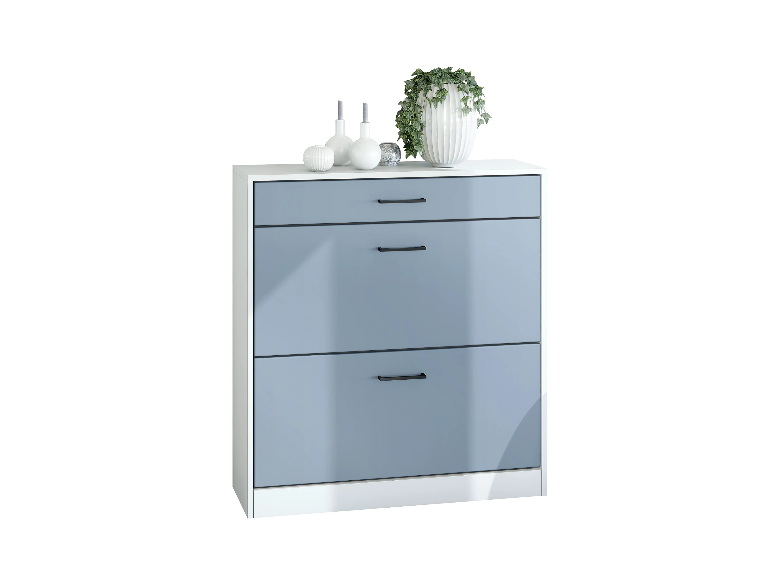 Armoire à chaussures inclinable Elvas 89 x 95,5 x 27 cm, caisson en blanc mat, façade en Denim mat