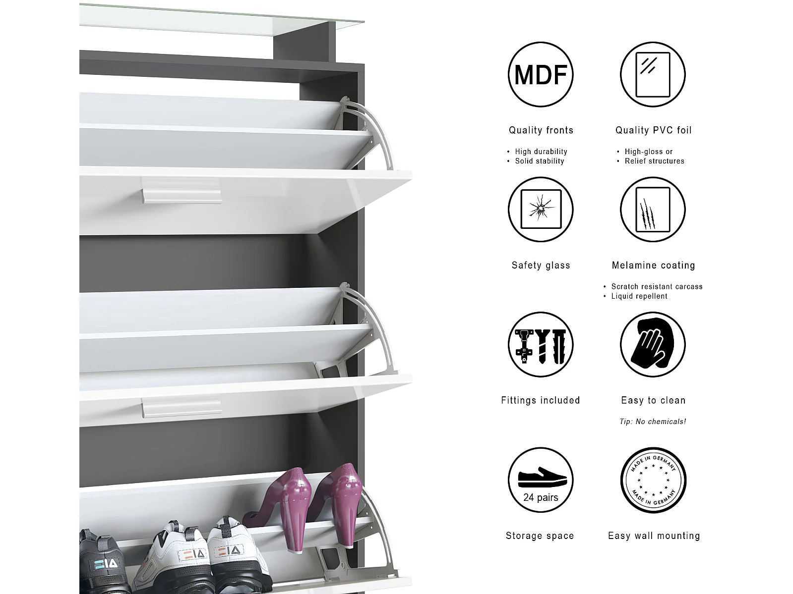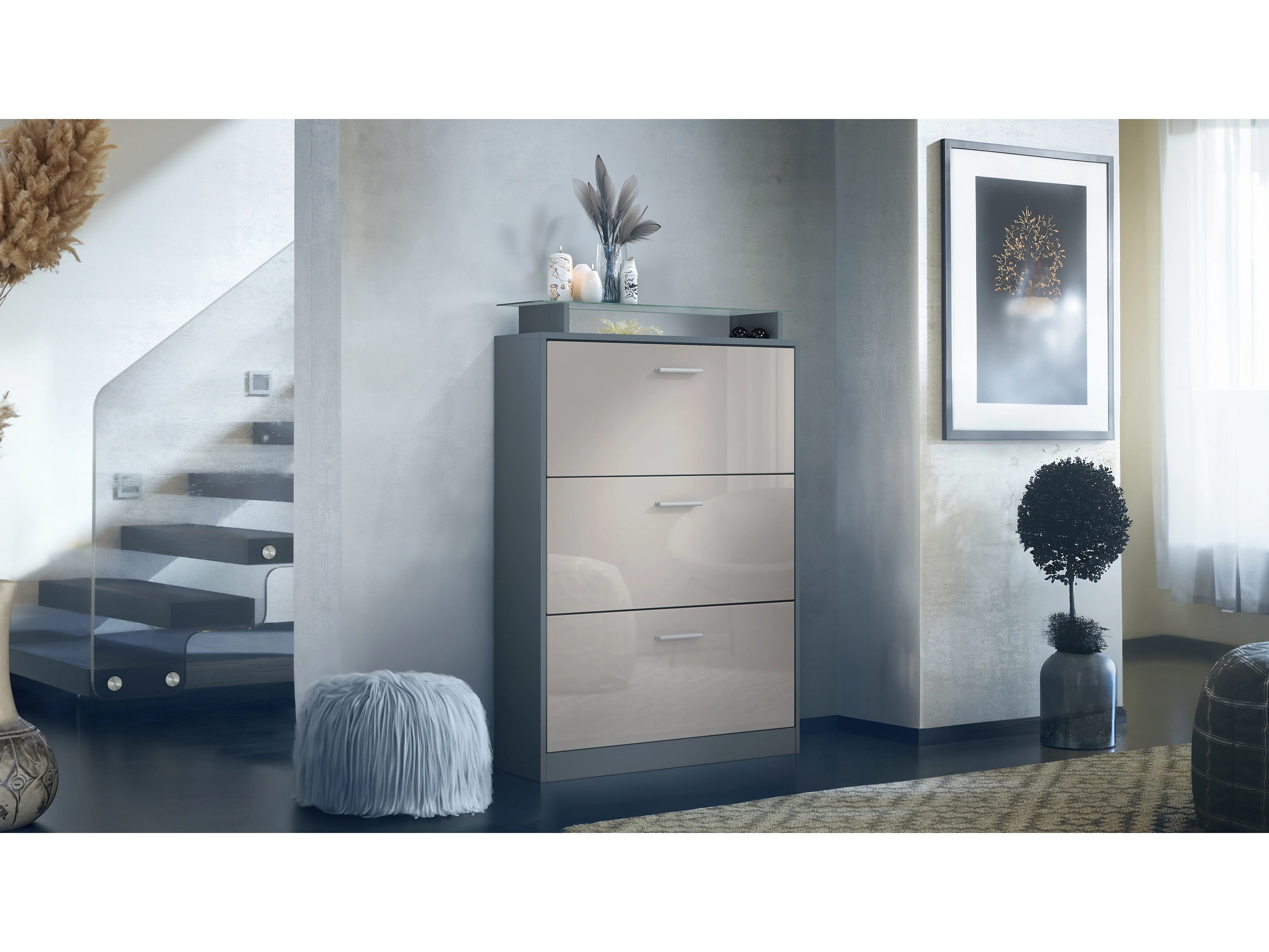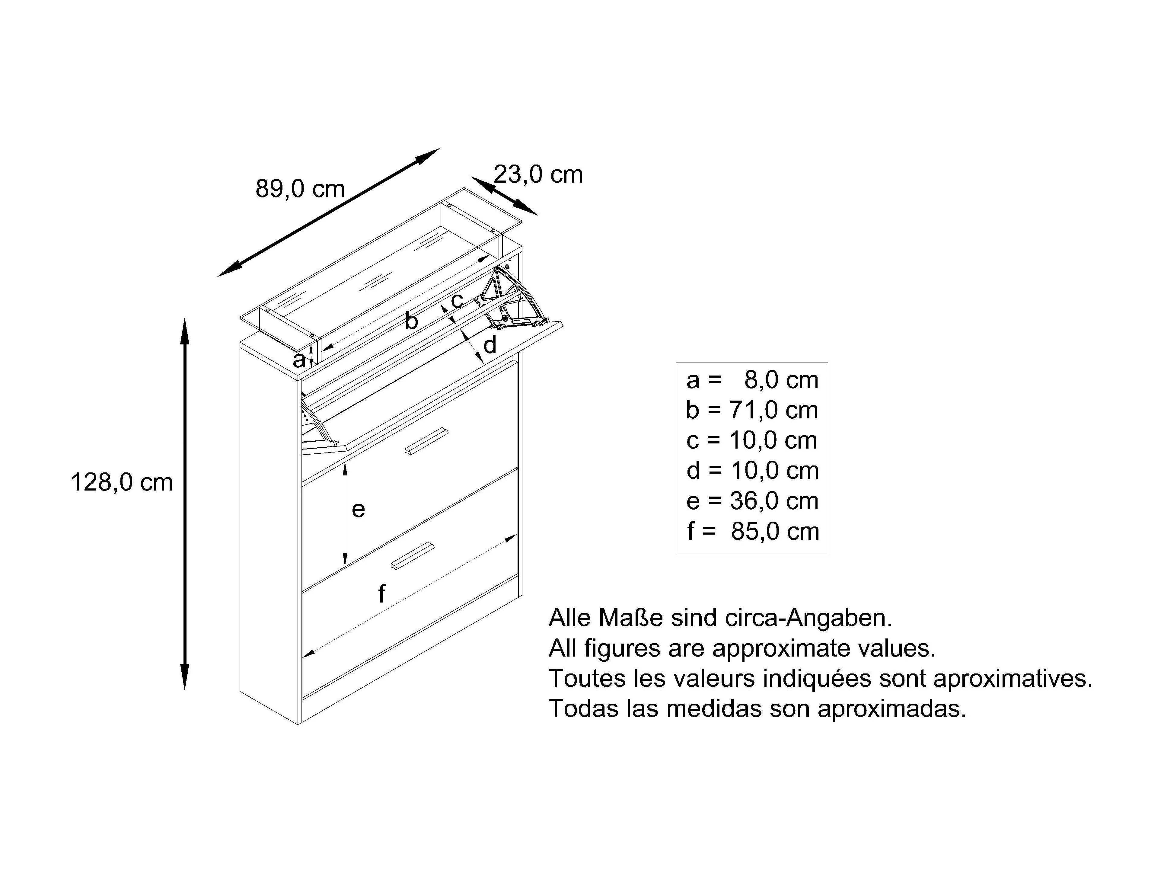 Armoire à chaussures Lavia, benne à chaussures pour 24 paires de chaussures avec 3 abattants et étagère en verre, / (89 x 128 x 23 cm)
