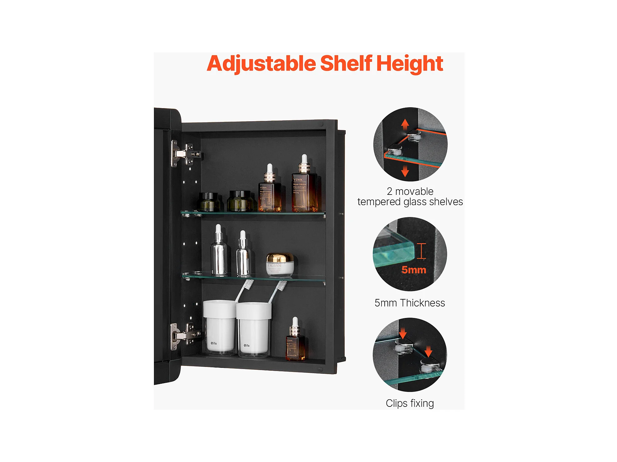 Armoire miroir de salle de bain avec étagères, acier inoxydable, noir (46x13.5x58 cm)