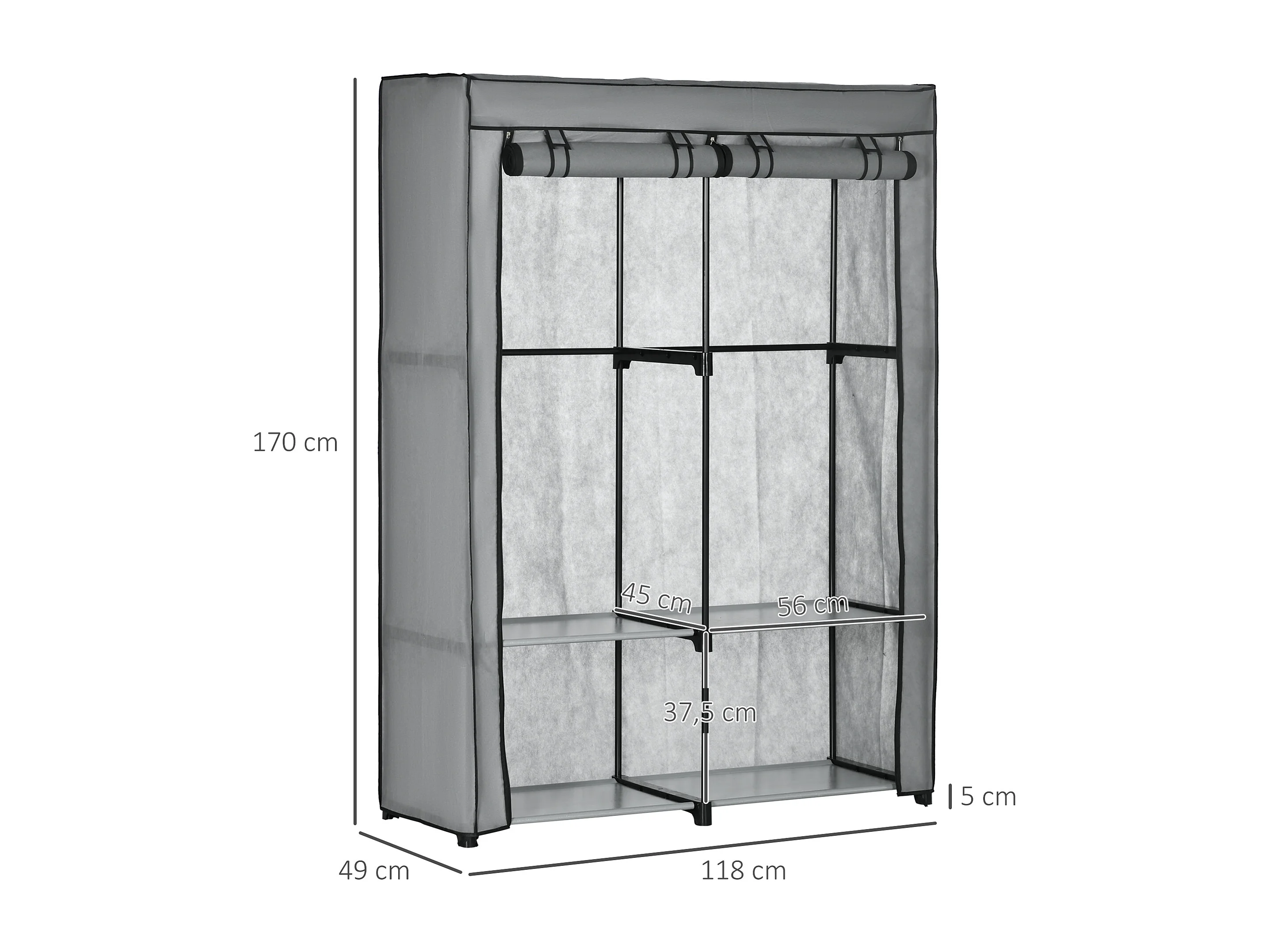 Armoire à vêtements en tissu avec 2 barres de suspension, 4 étagères, gris clair (118x49x170 cm)
