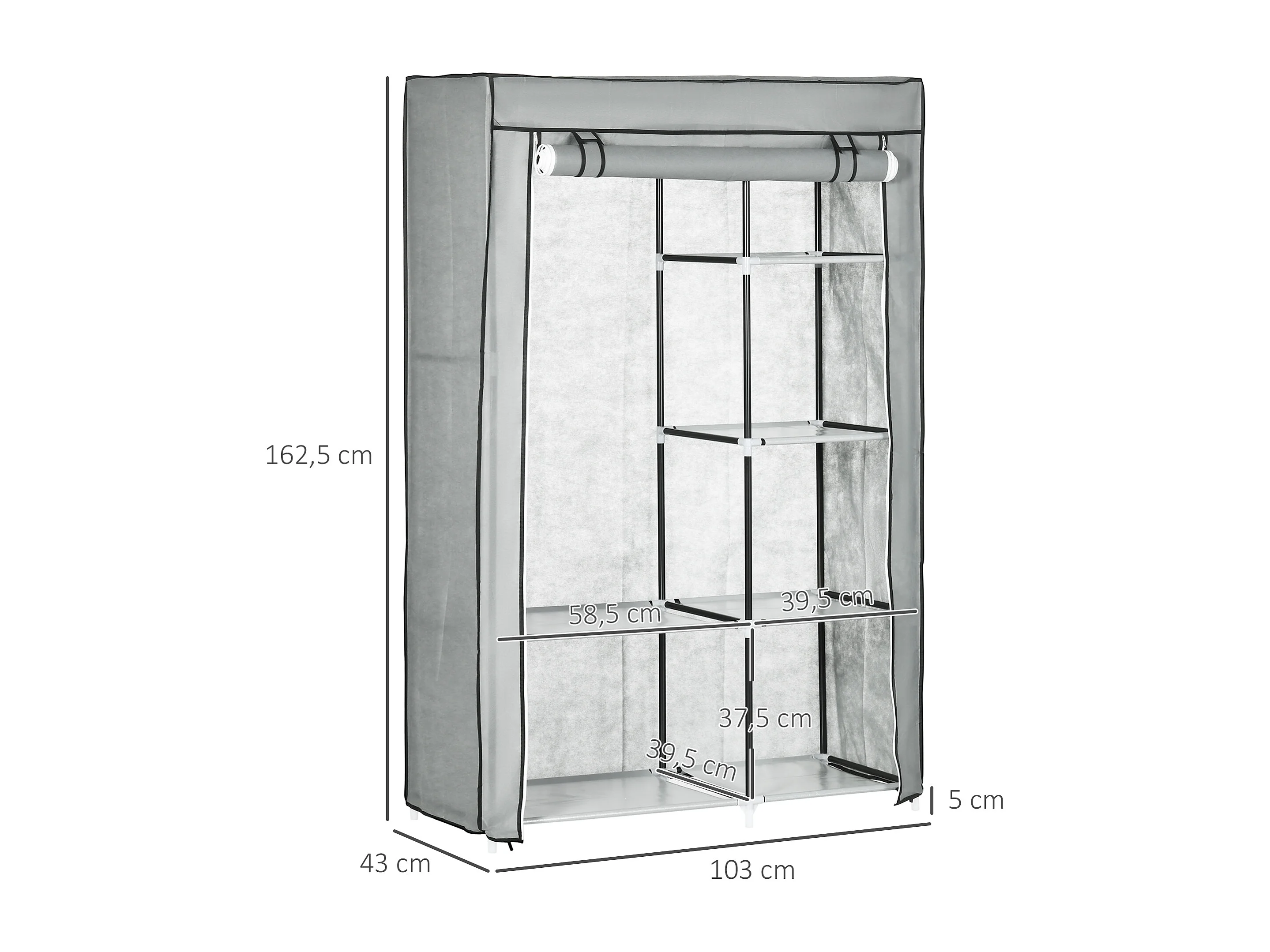 Armoire textile pliable avec 5 compartiments et tringle, structure acier, gris clair (83x42.5x162.5cm)