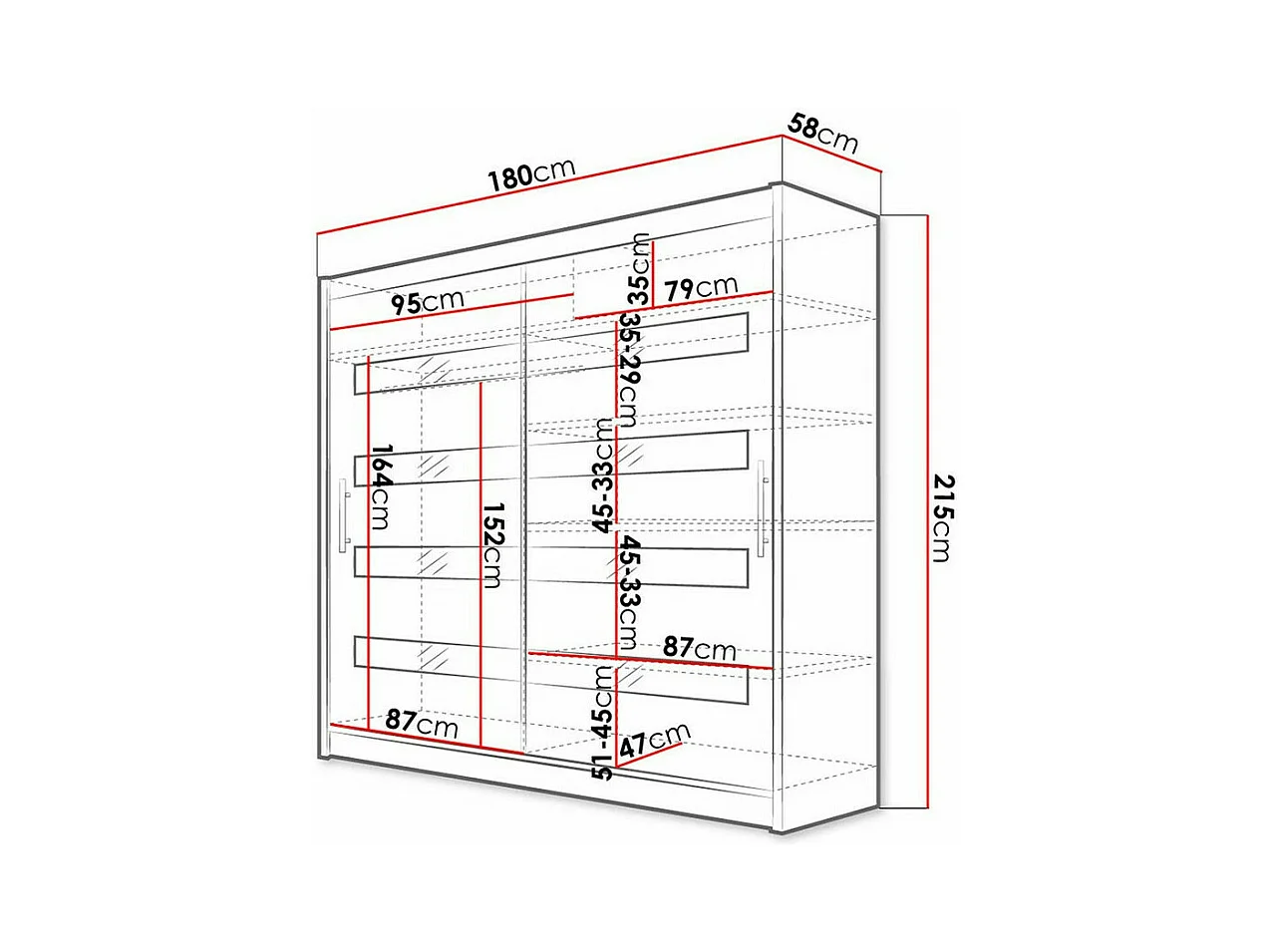Armoire Closico 156, Blanc brillant|Noir, 215x180x58cm, Portes d'armoire: Coulissantes