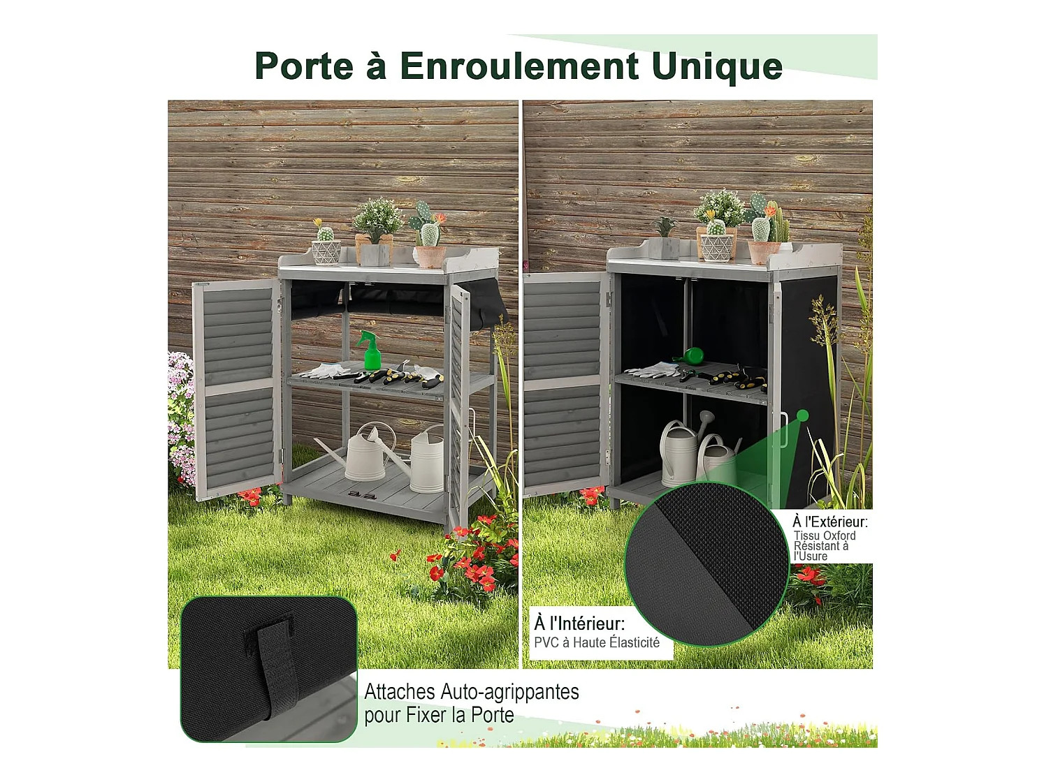 Armoire de jardin à 2 Étagères et Plateau en Métal Plaqué, Cabane de Rangement en Bois de Sapin avec Portes, pour Terrasse Jardin Cour 67 x 47 x 100 cm, Gris