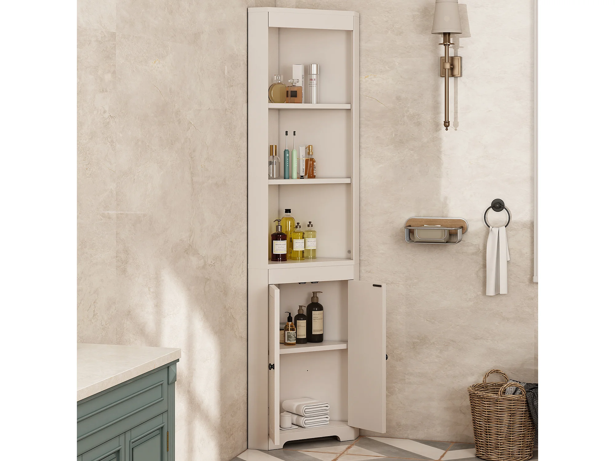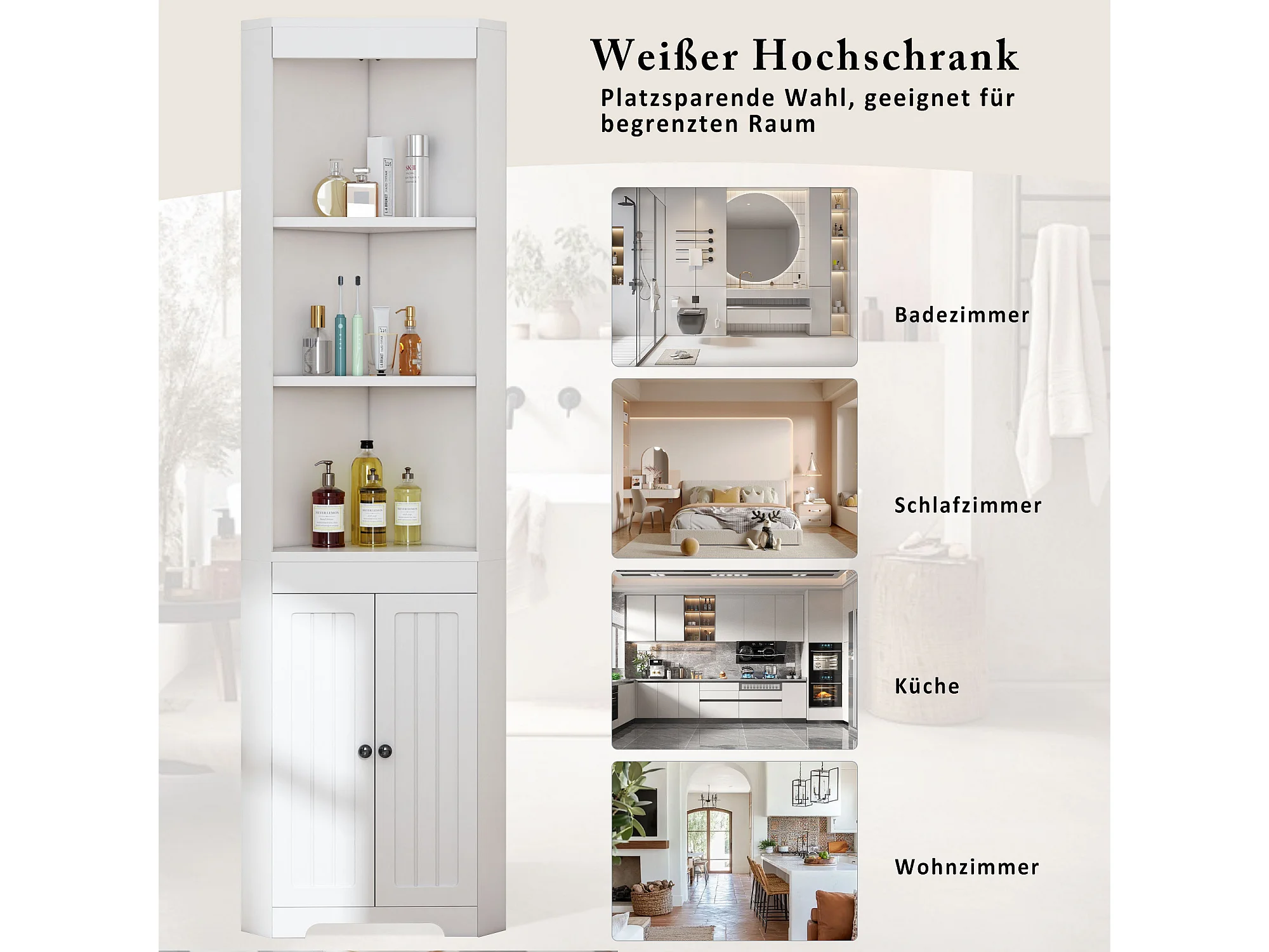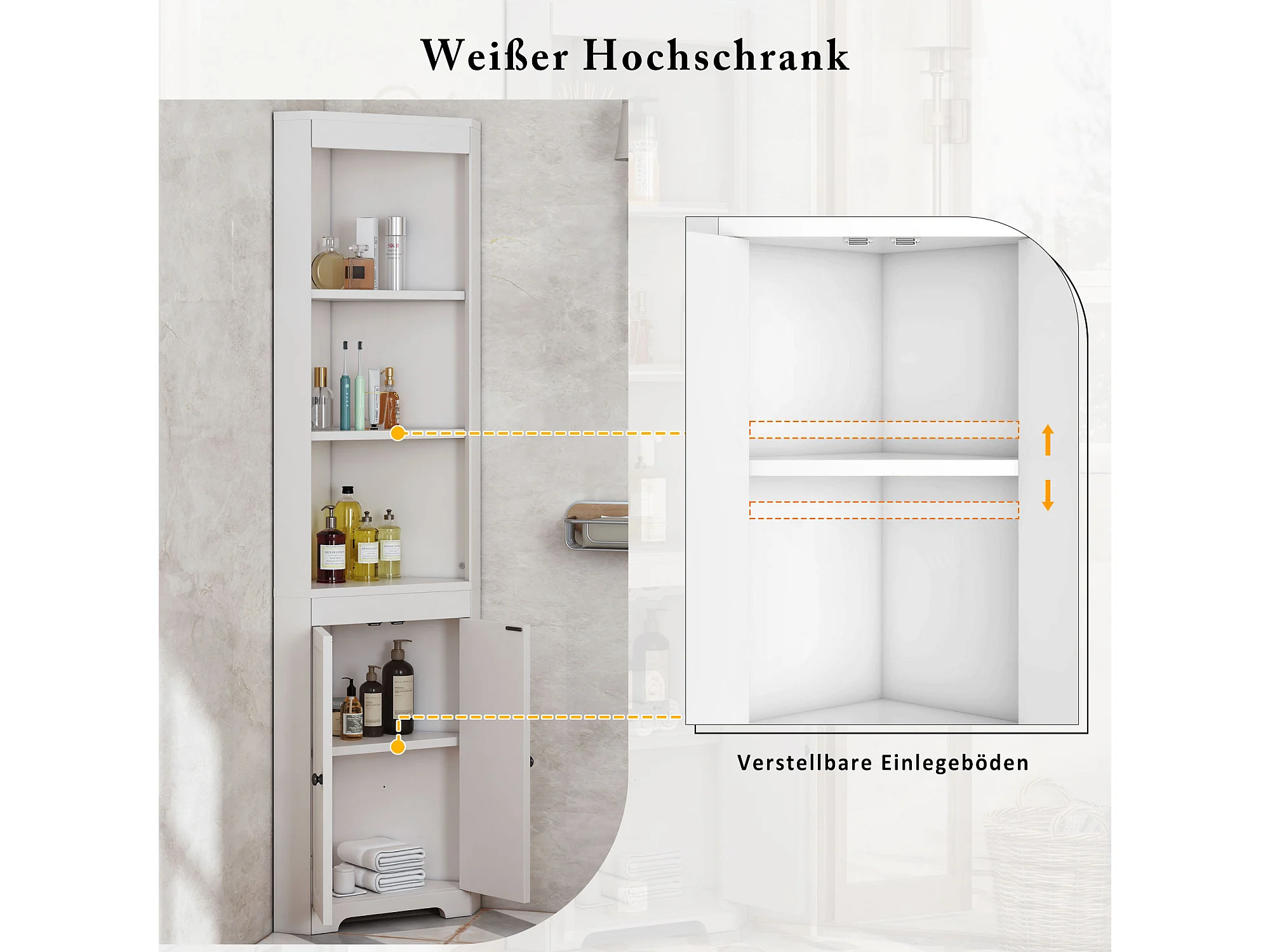 Armoire de salle de bain avec 3 étagères ouvertes, portes en verre trempé, étagères réglables, MDF peint, blanc (49.5x35x170 cm)