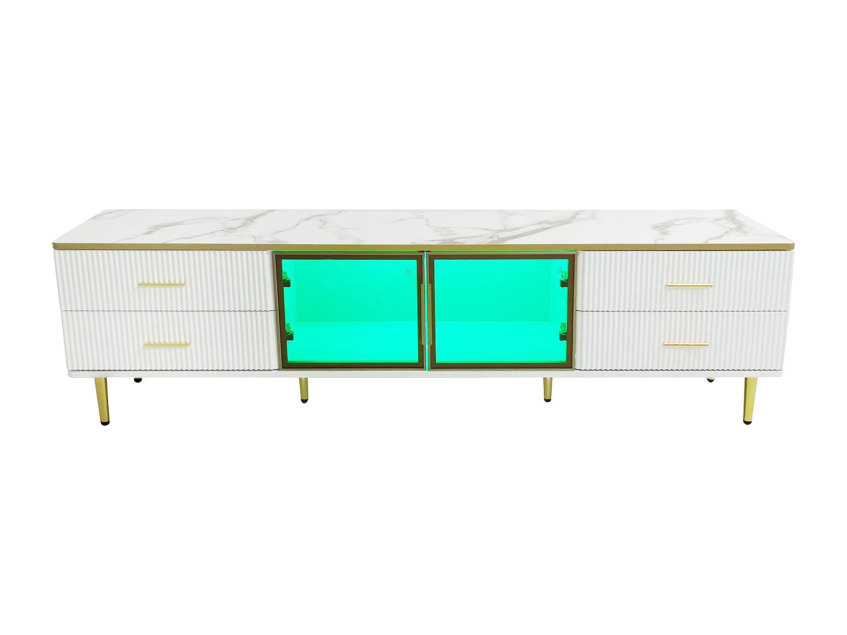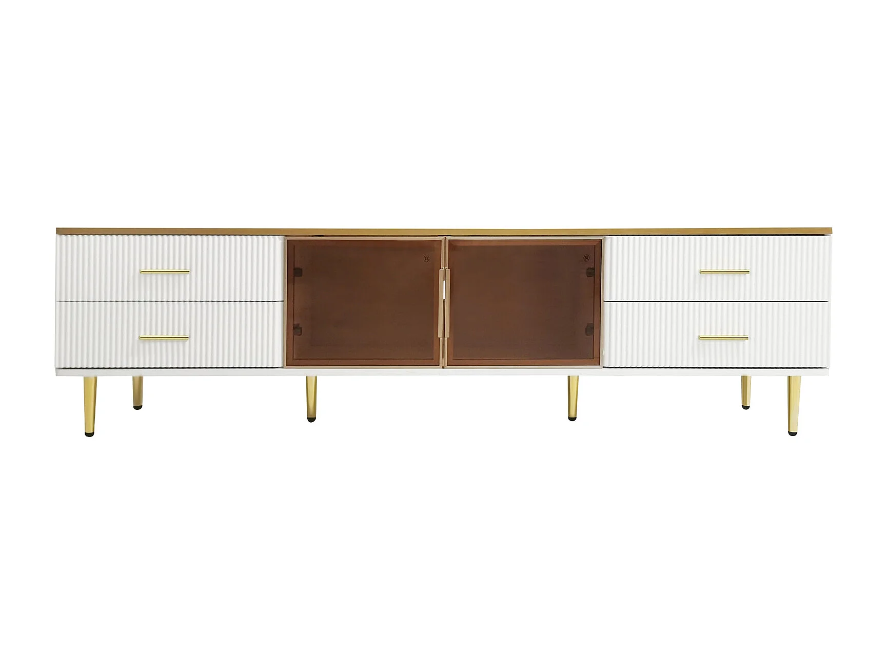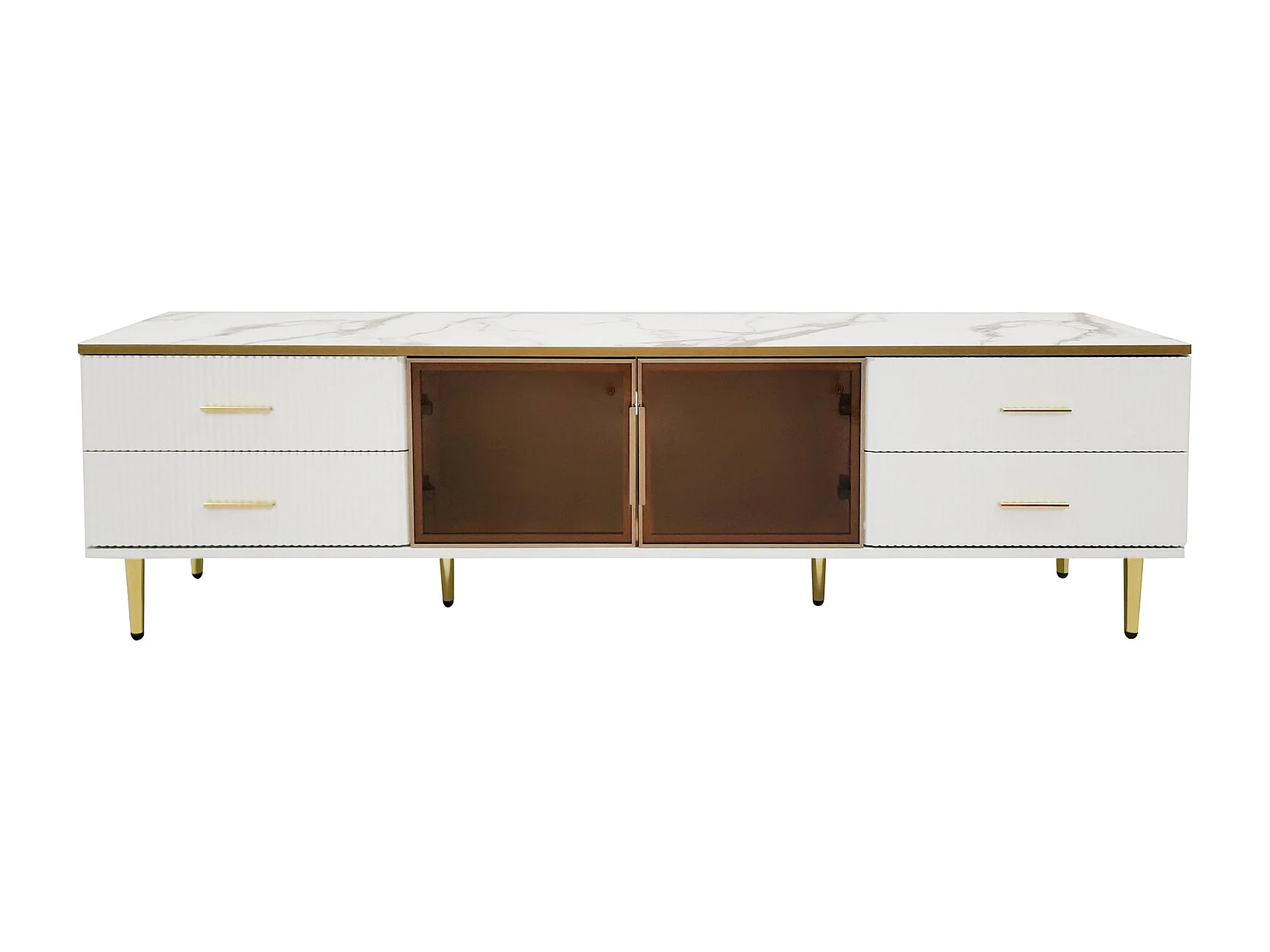 Armoire de télévision en mammoroptique, armoire de télévision avec 4 pieds, 4 tiroirs structurés avec poignées dorées et deux portes brunes en verre cuisiné,