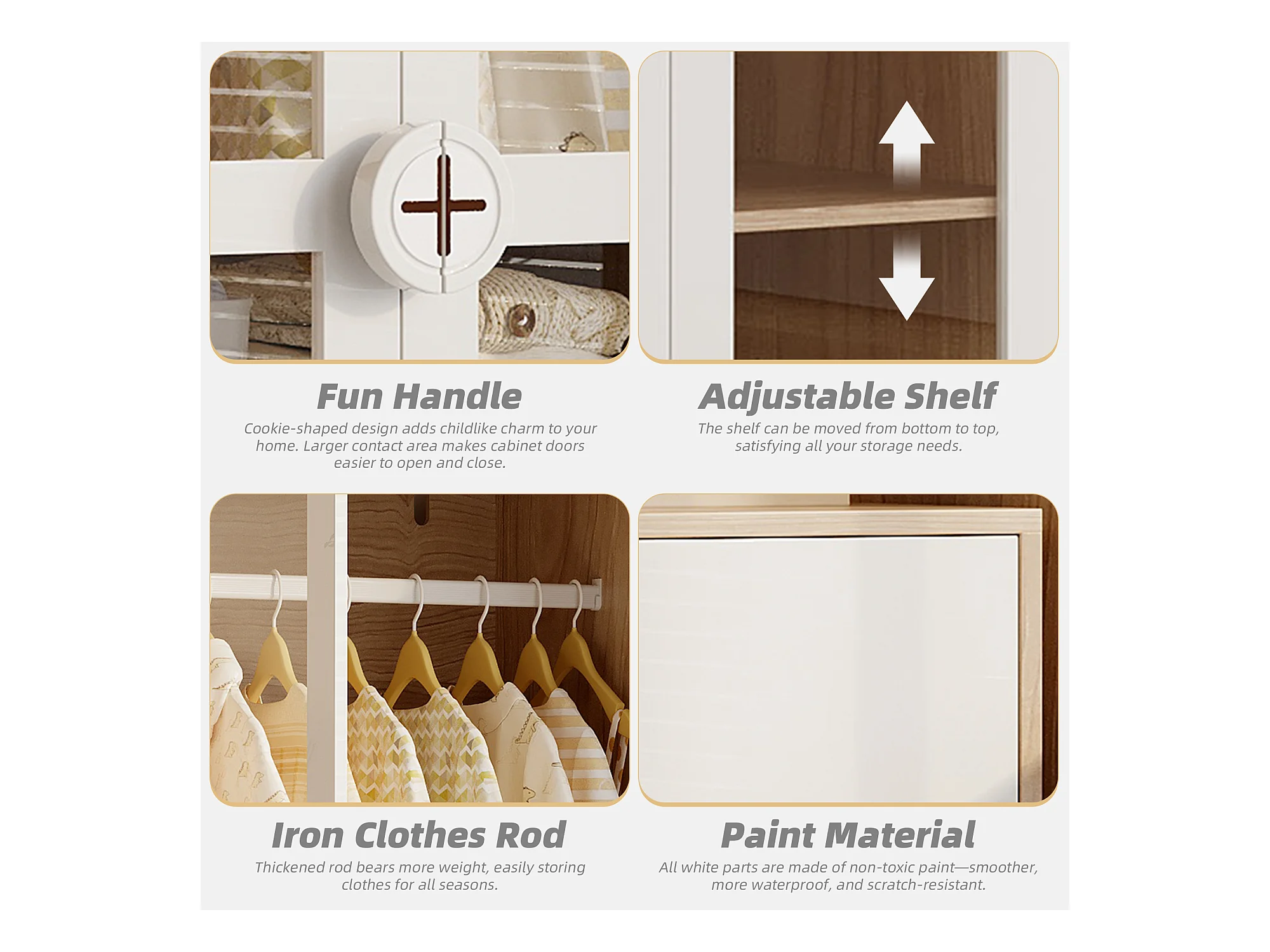 Armoire enfant 80x50x150 cm - 2 portes vitrées - avec tringle à vêtements - étagères réglables - blanc + naturel