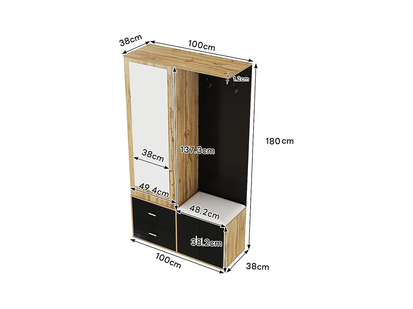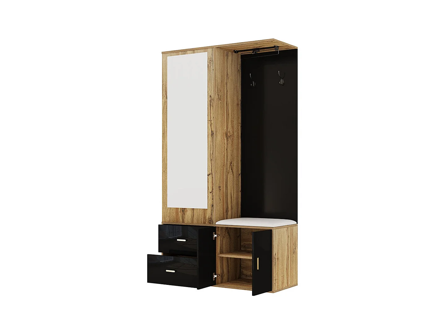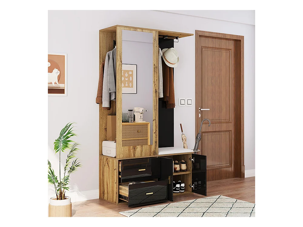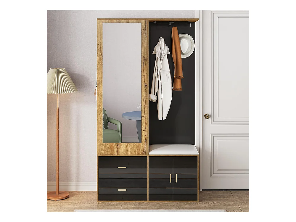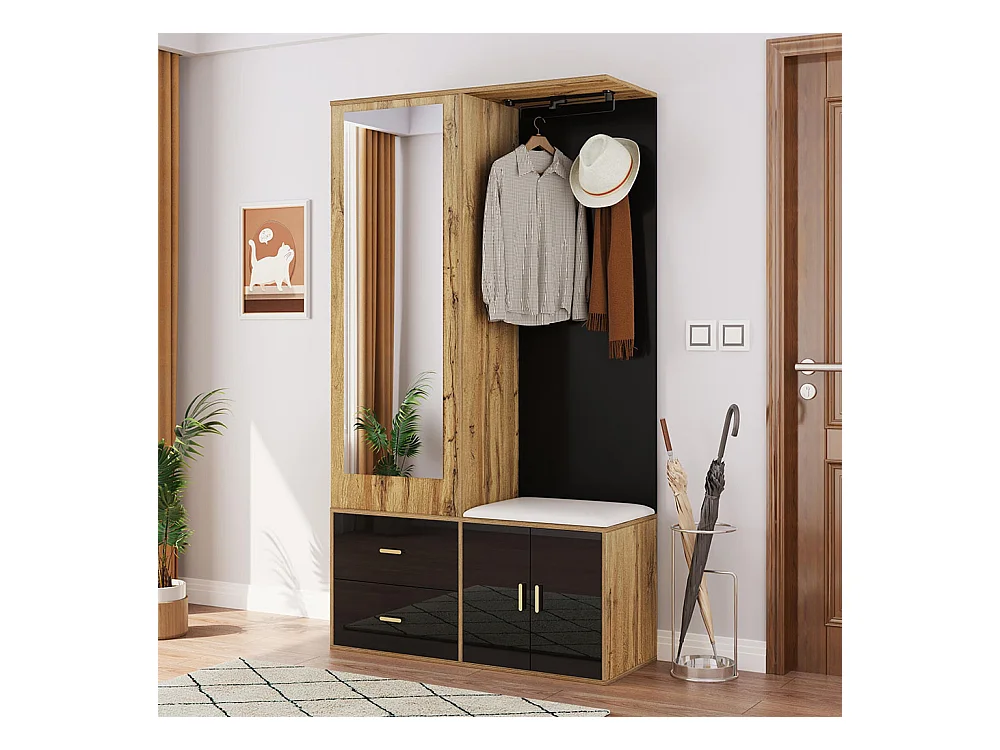 Armoire Ensemble rangement noir bois miroir armoire chaussures banc crochets cintres coulissants noir+naturel