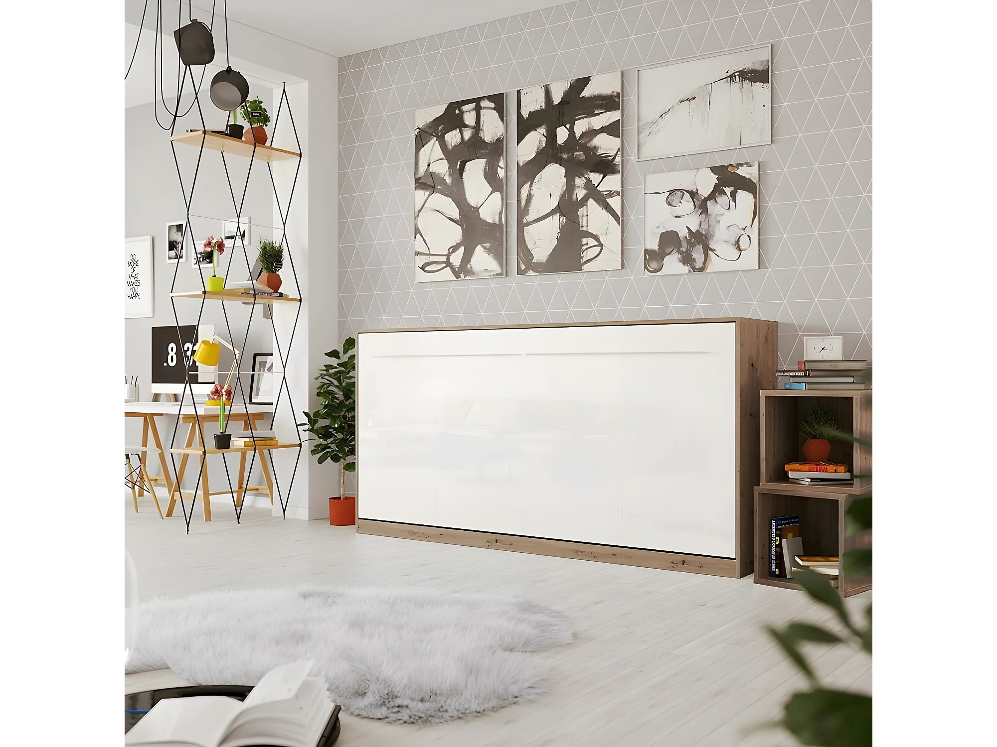 Armoire Lit escamotable 90x200cm Supérieur Horizontal Lit Rabattable Lit Mural Chêne Sauvage/blanc brillant