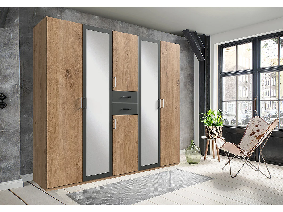 Armoire Placard, meuble de rangement avec 2 miroirs coloris Imitation chêne poutre, rechampis graphite - Longueur 225 x Hauteur 208 x Profondeur 58 cm