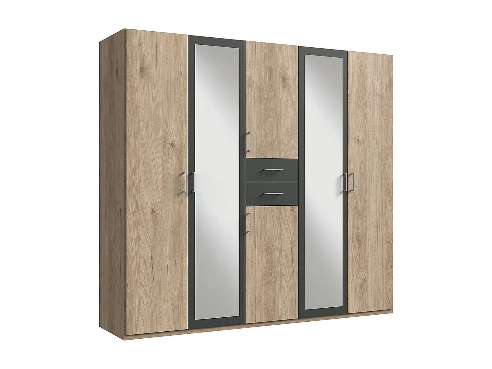 Armoire Placard, meuble de rangement avec 2 miroirs coloris Imitation chêne, rechampis graphite - Longueur 225 x Hauteur 208 x Profondeur 58 cm