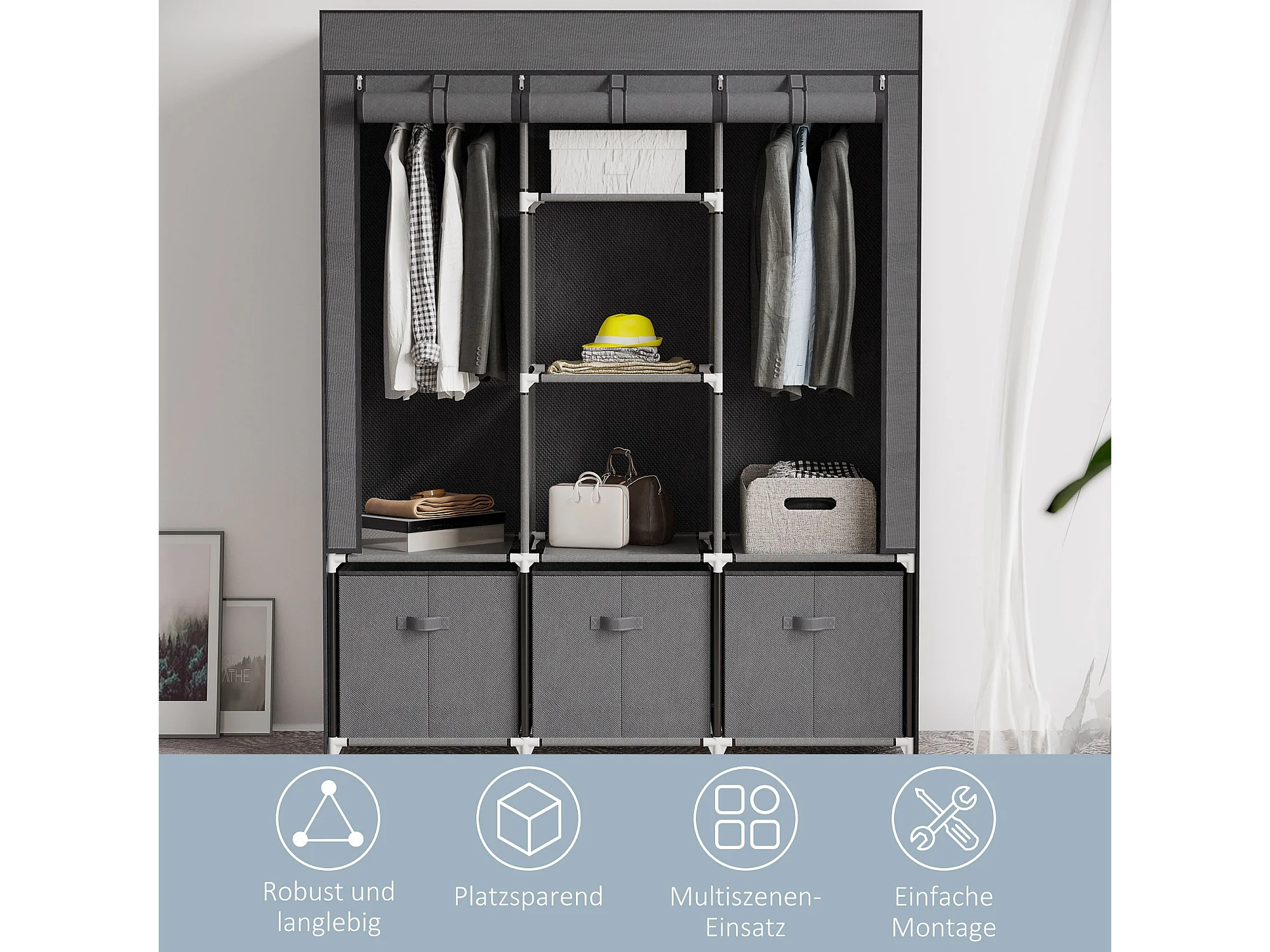 Armoire pliante en tissu gris foncé avec tiroirs, tringle et fermeture éclair – pratique et gain de place pour chambre ou couloir