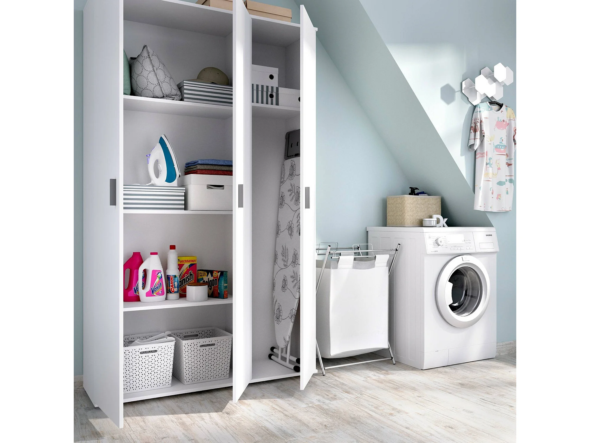 Armoire polyvalente Dmeli, Armoire porte-balai multifonctionnelle, armoire 3 portes, 116x35h190 cm, Blanc