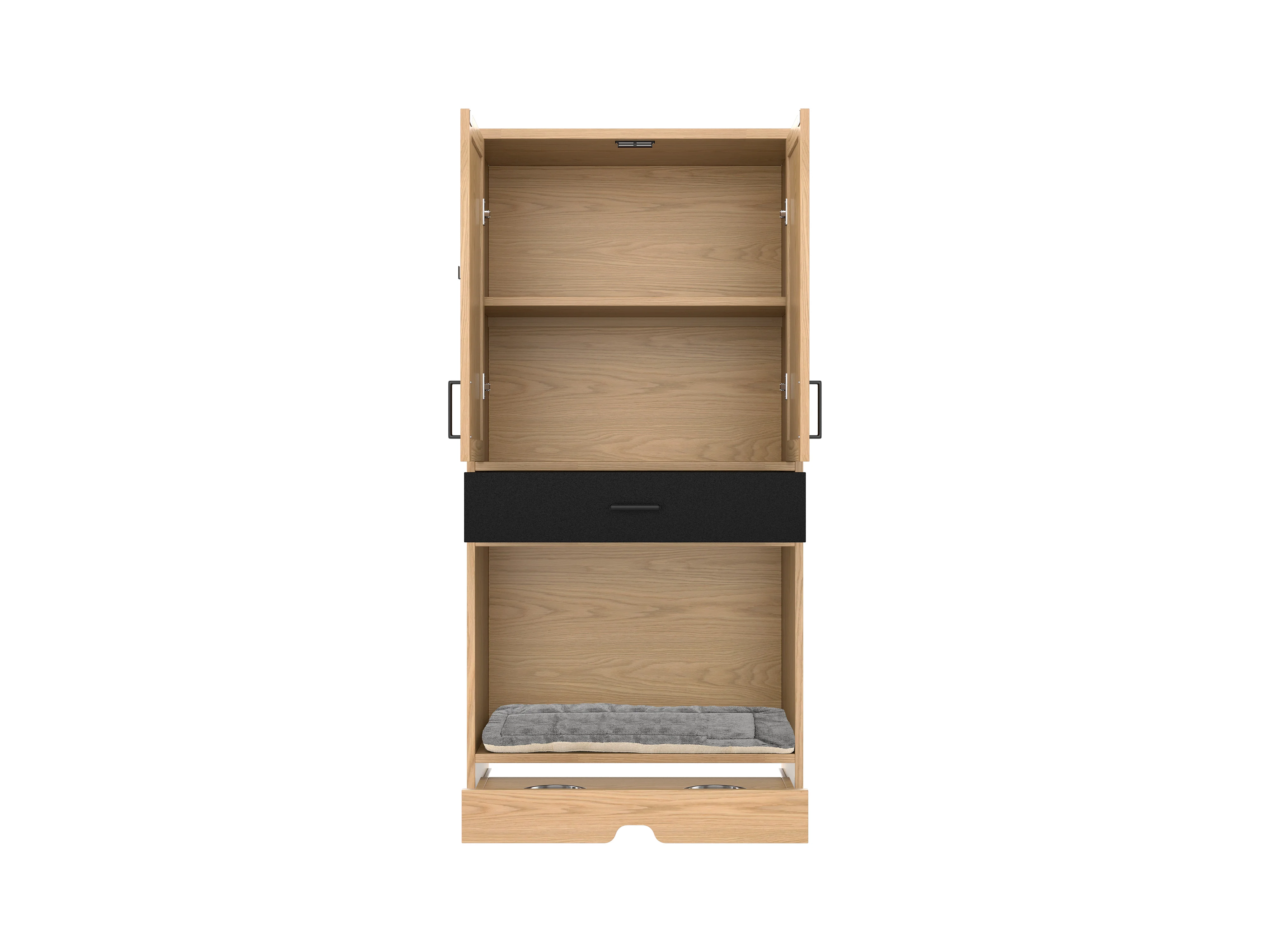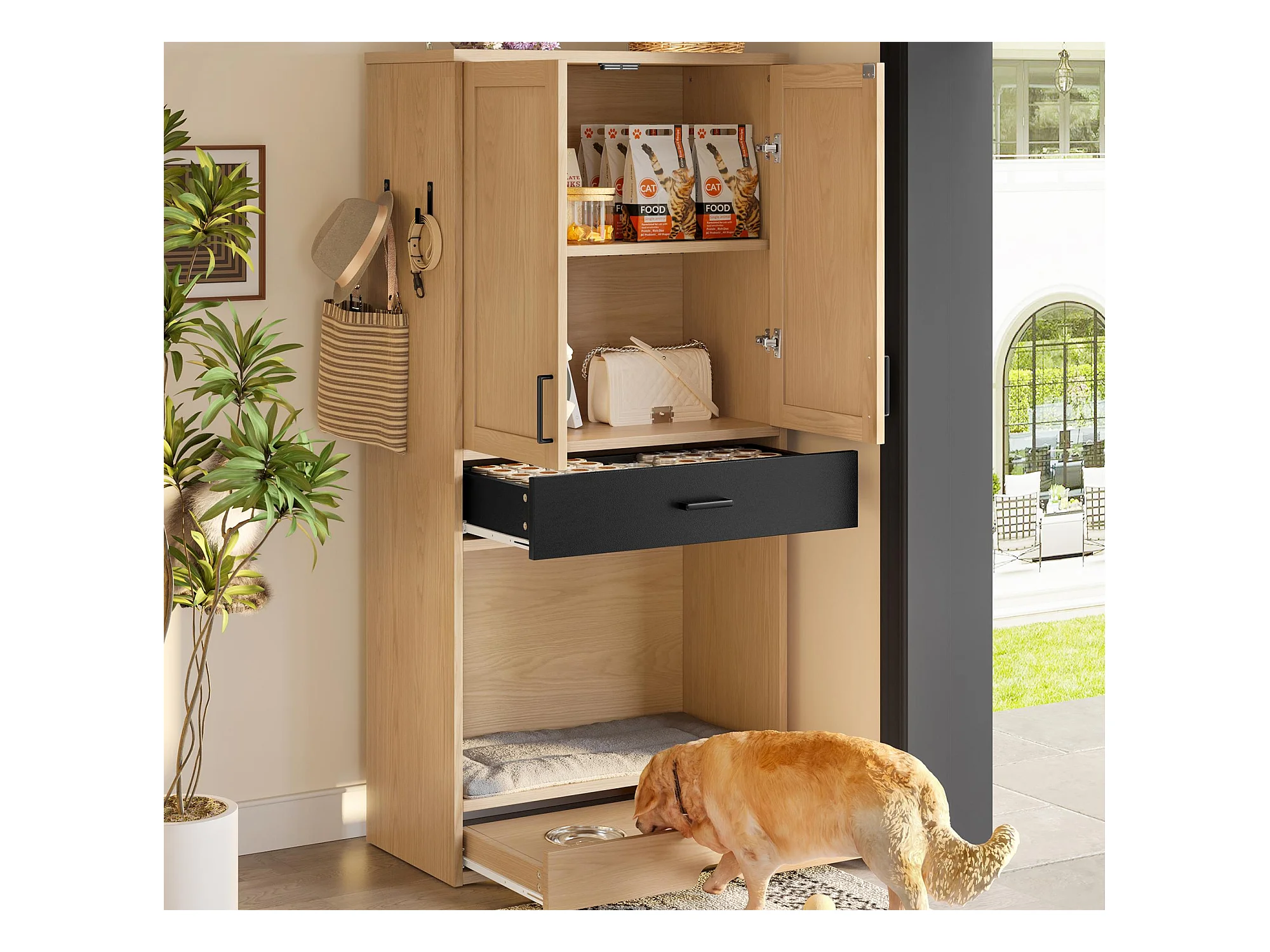 Armoire pour animaux 79x40x160 cm - 2 portes et 2 tiroirs - avec gamelle et tapis - avec crochets - couleur naturelle