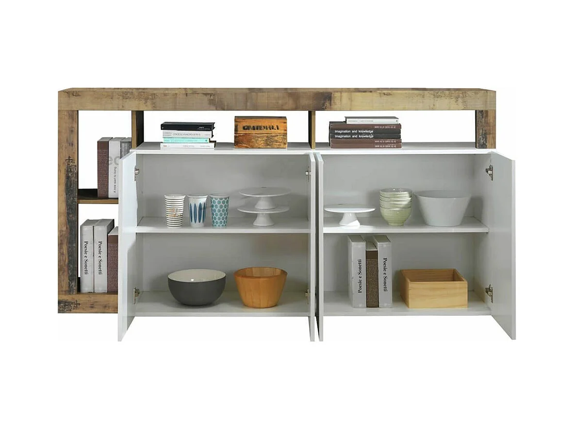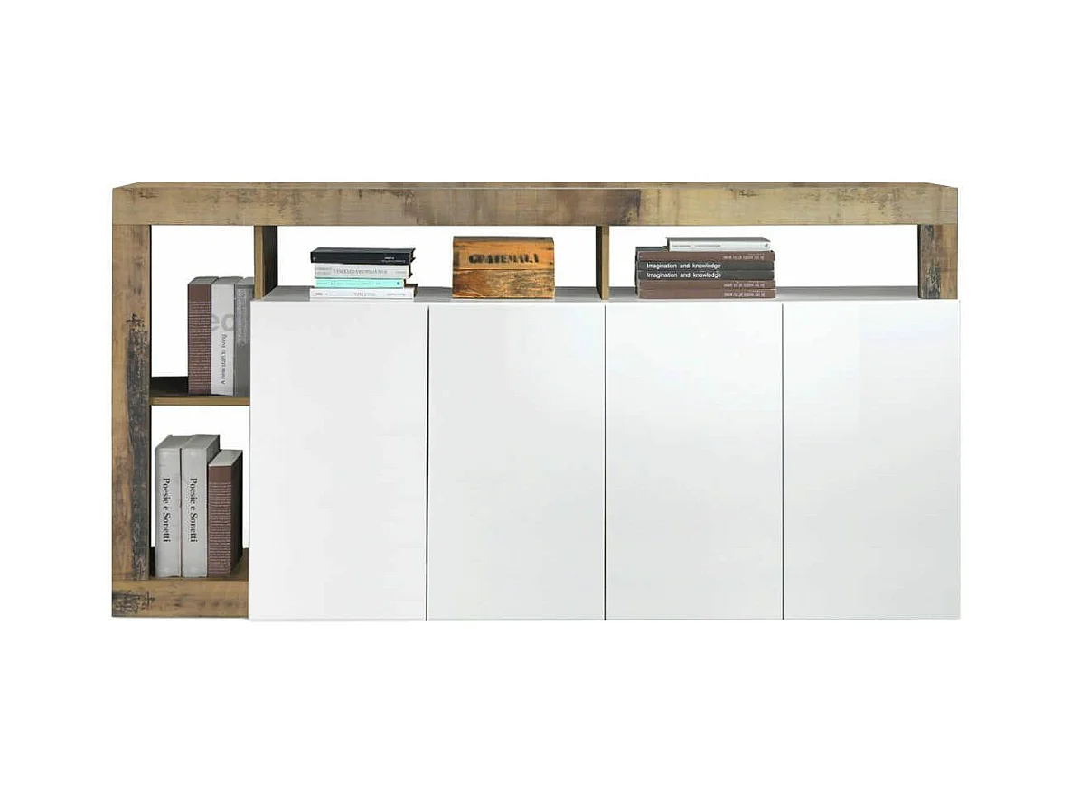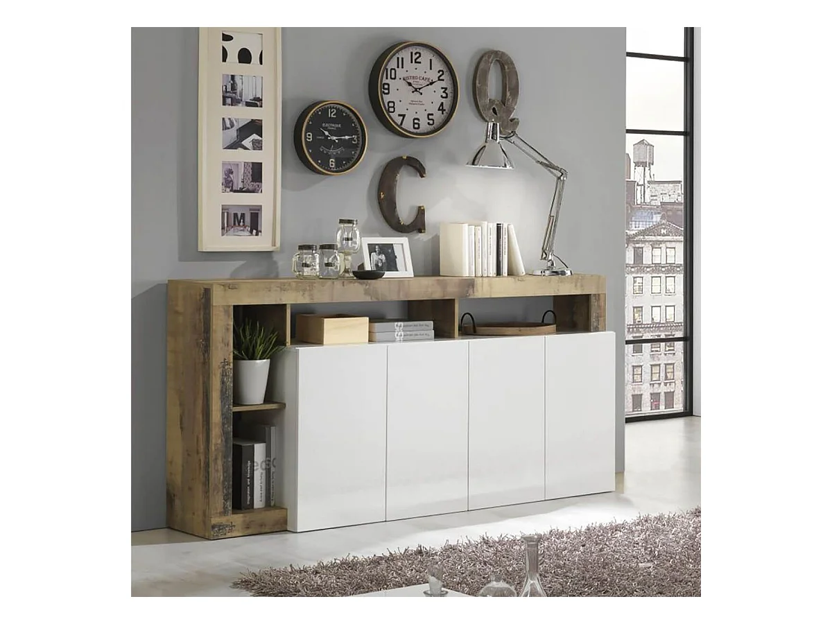 ARTURO - Buffet 4 Portes Blanc Laqué Encadrement Niches Aspect Bois Antik