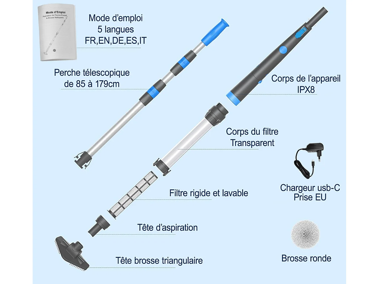 Aspirateur et brosse électrique rechargeable pour piscine et spa - 260cm - Bleu