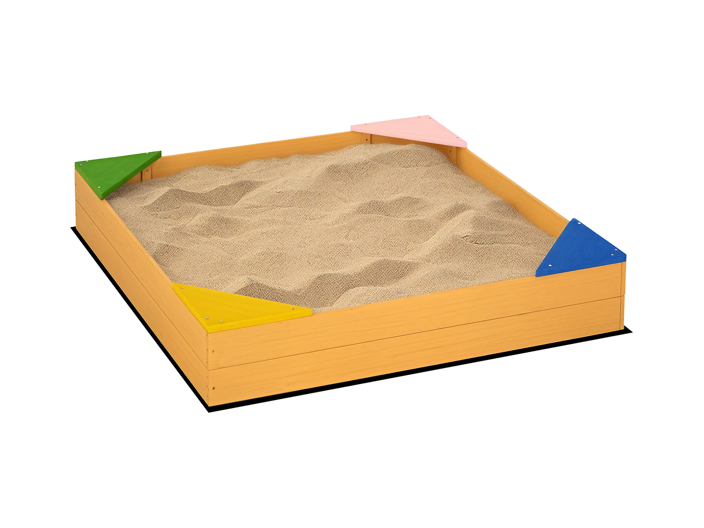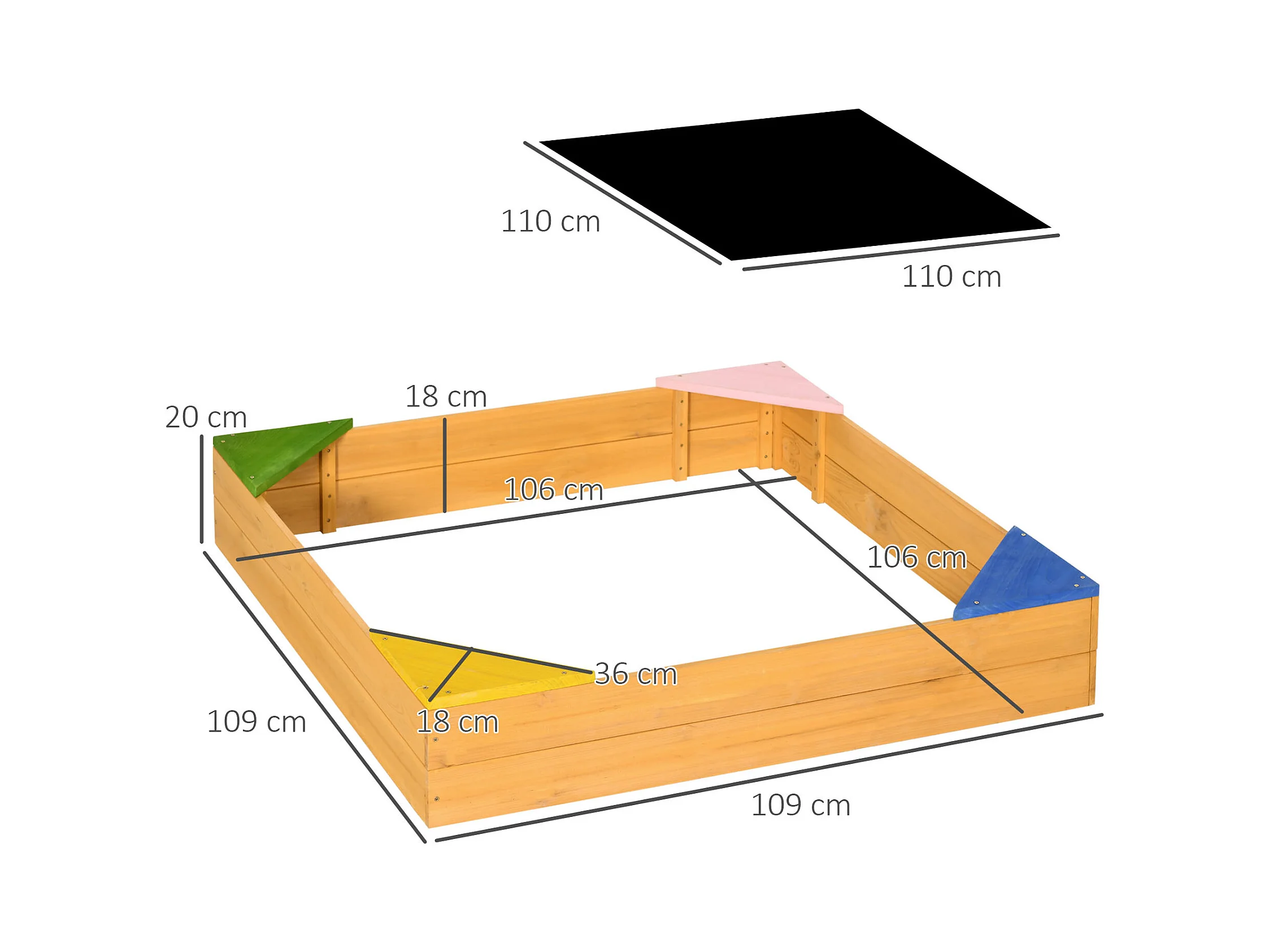 Bac à sable carré en bois pour enfants 4 assises en coin et film protection 109 x 109 x 19,8 cm bois naturel