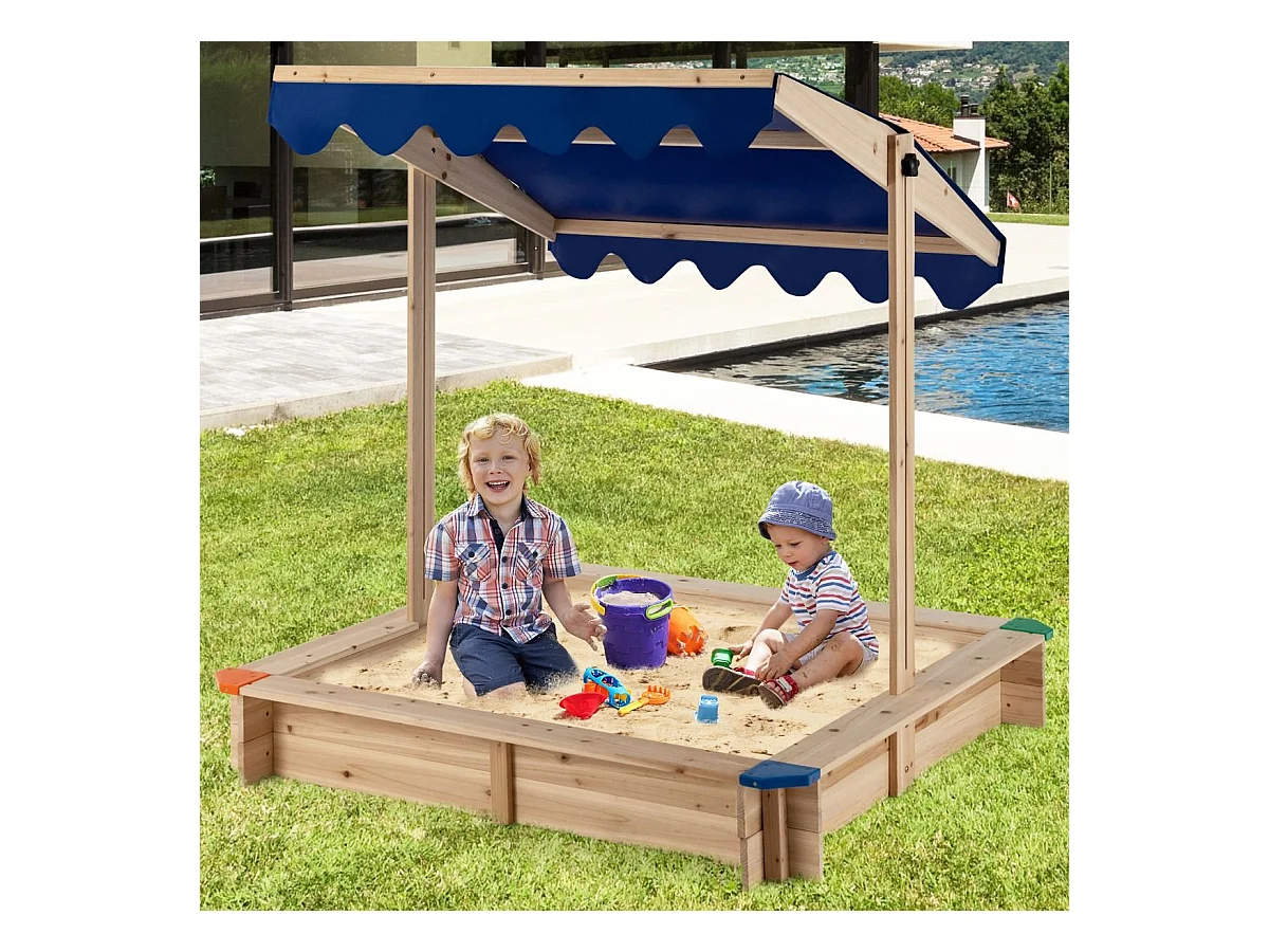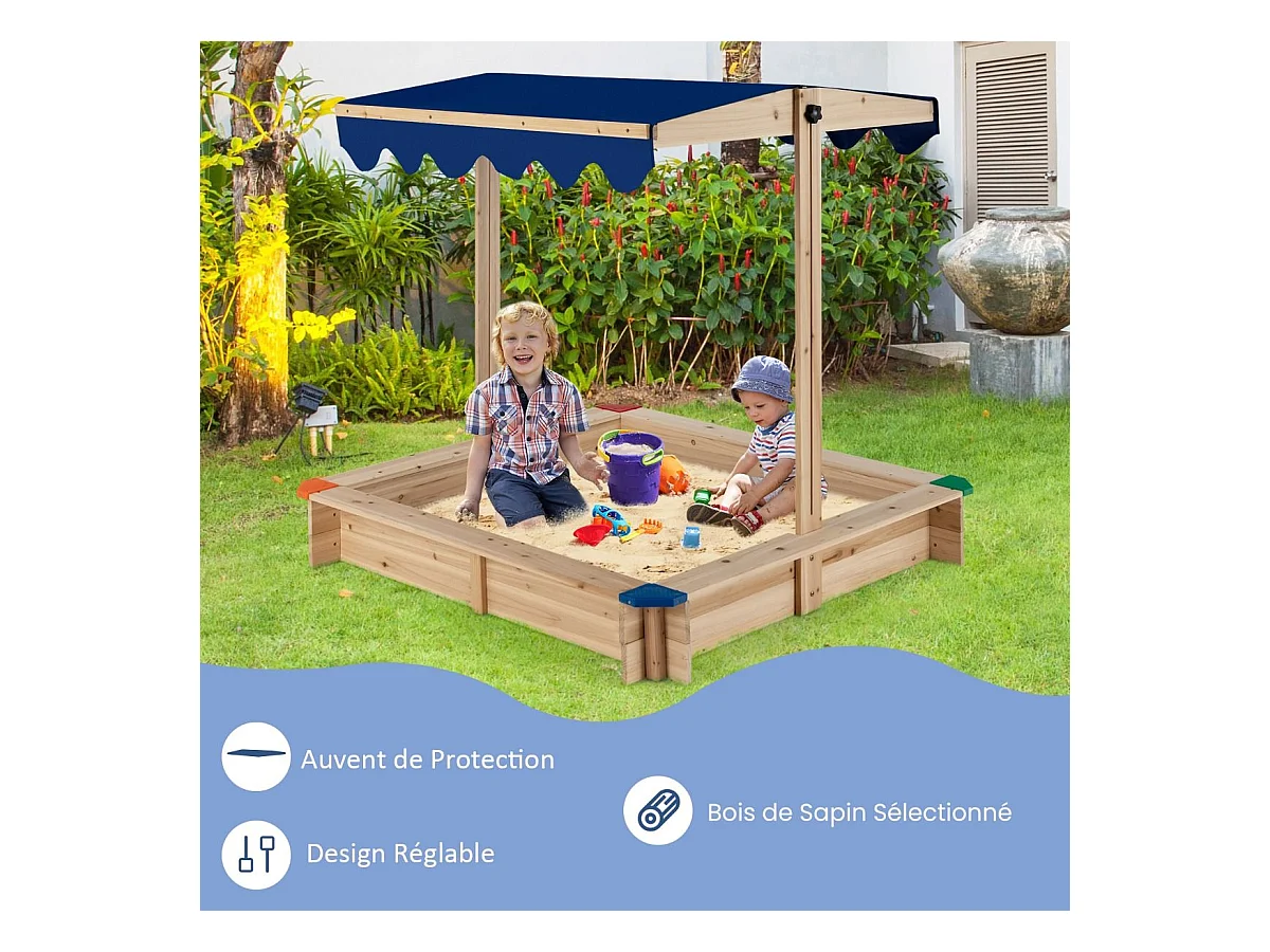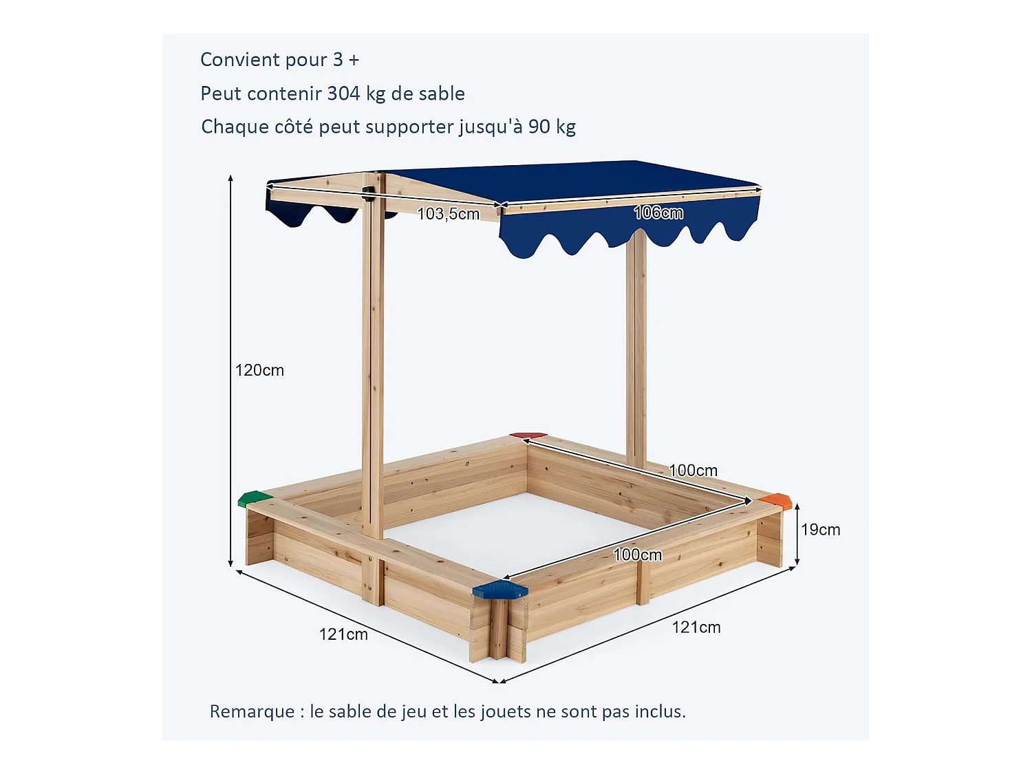 Bac à Sable en Bois de Sapin avec Toit Réglable & Inclinable, Bac à Sable Extérieur avec Conception sans Fond, Charge 90kg pour Enfant de 3 Ans+, 121 x 121 x 120 cm