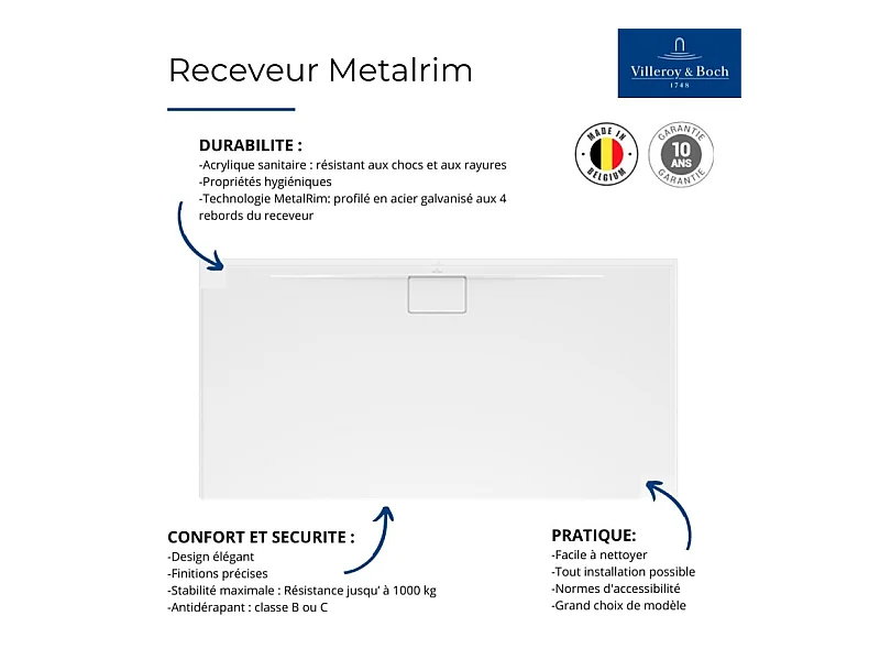Bac douche 120 80 VILLEROY ET BOCH Architectura Metalrim acrylique antidérapant blanc