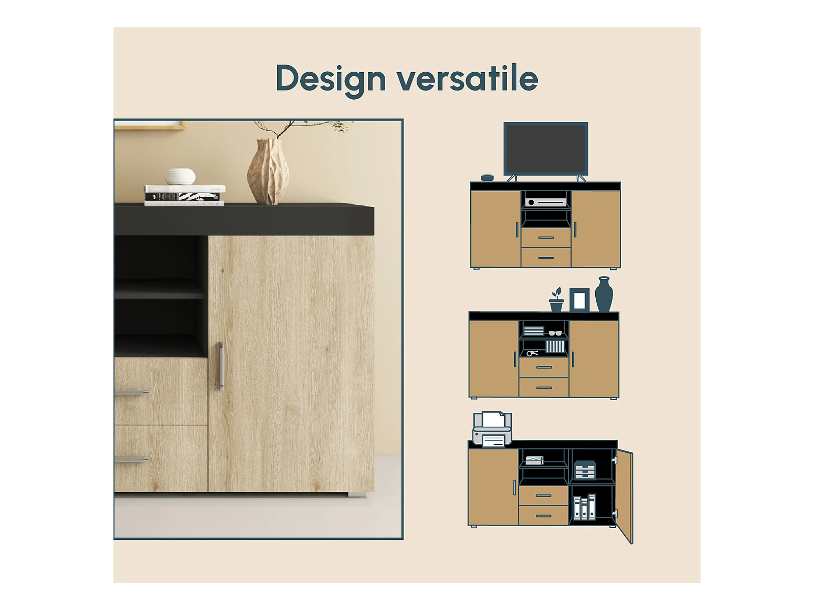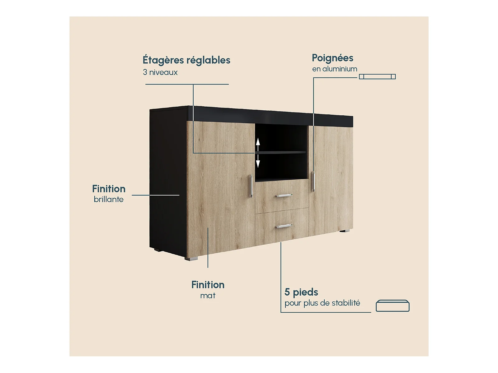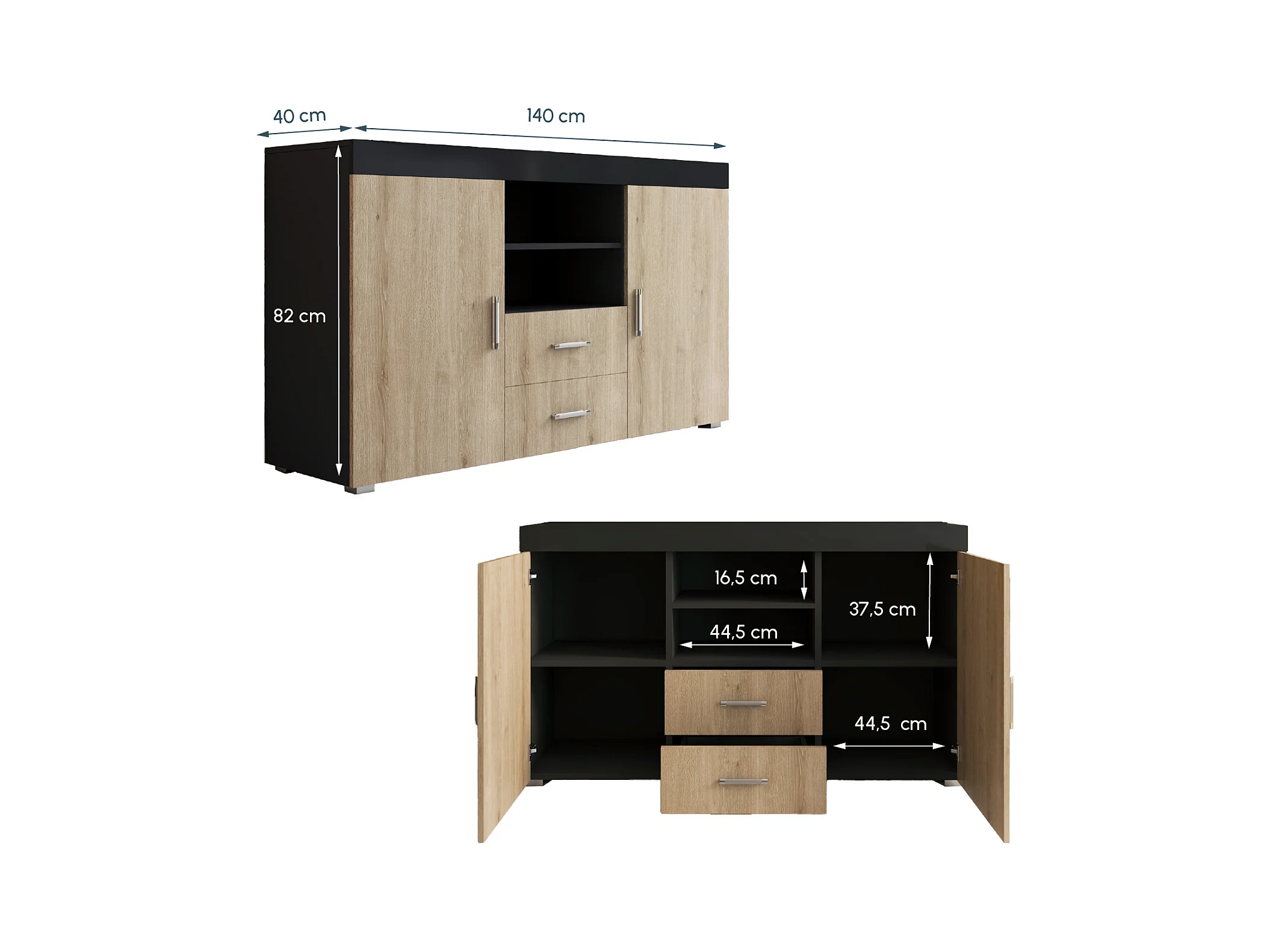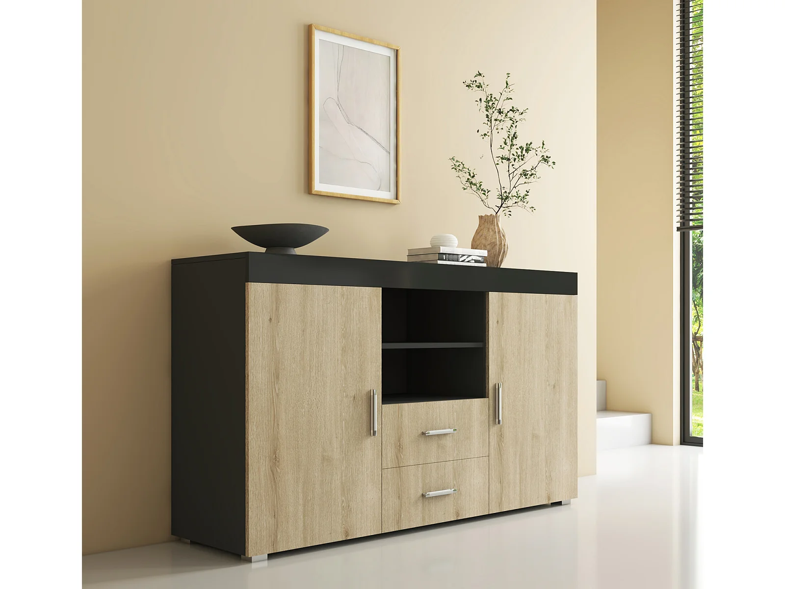 Bahut Buffet pour Salon Salle à manger en Noir et Sonoma 140x40x80cm Roque