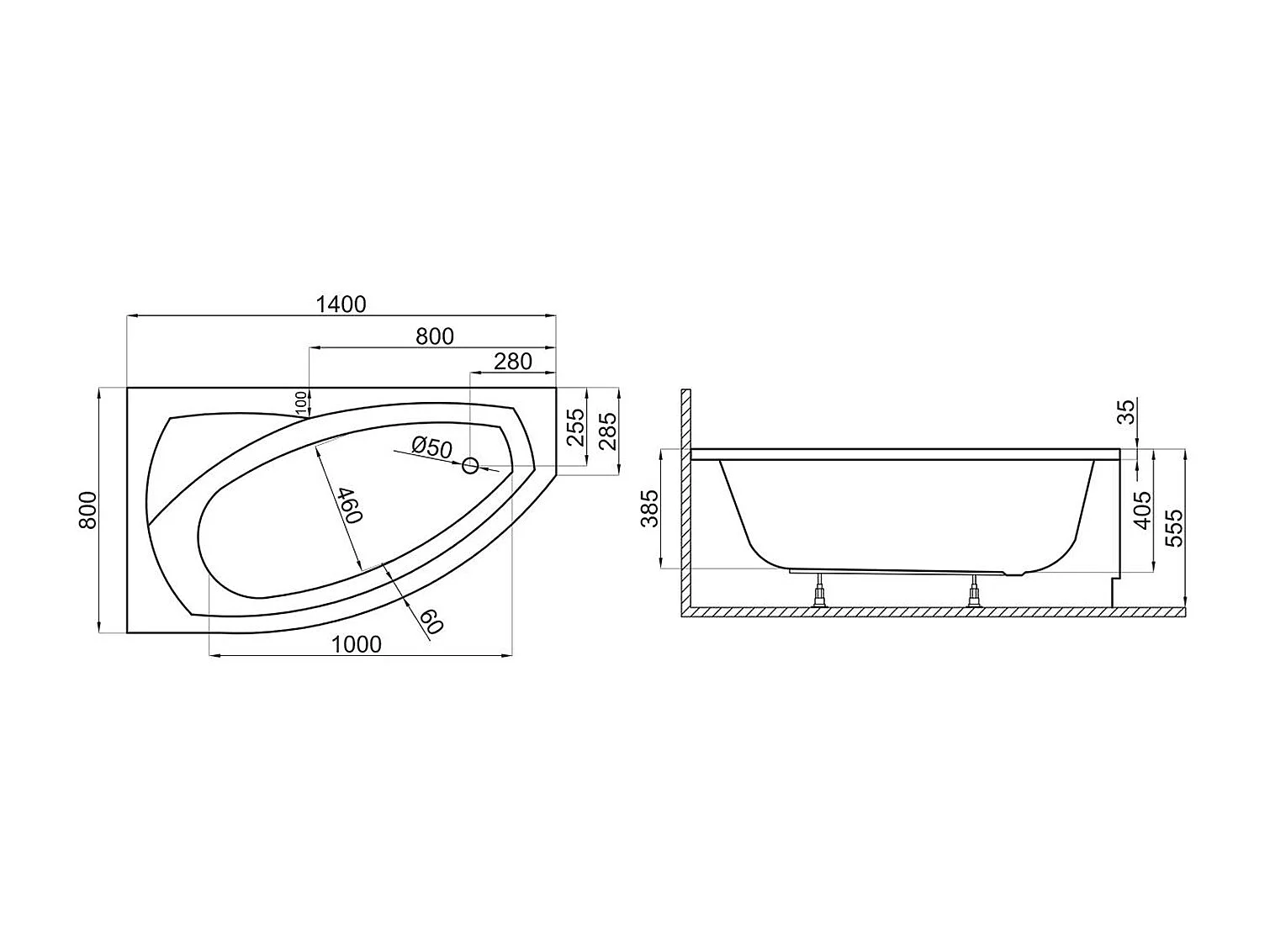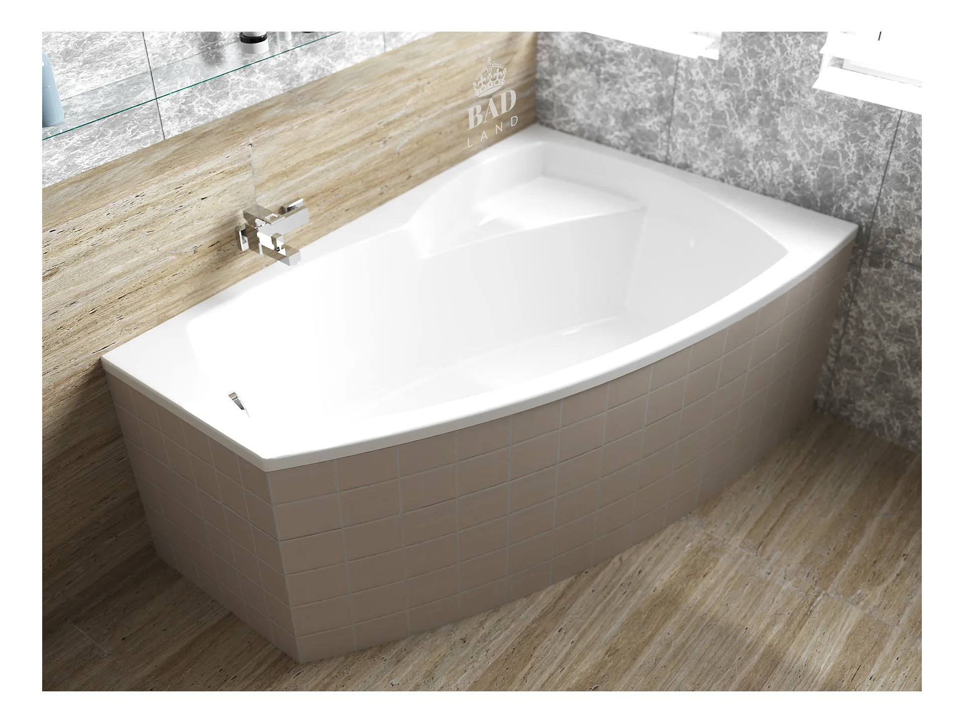 Baignoire asymétrique 140x80 Droite FRIDA acrylique blanc, sans Habillage + Pieds + Vidage à chromé