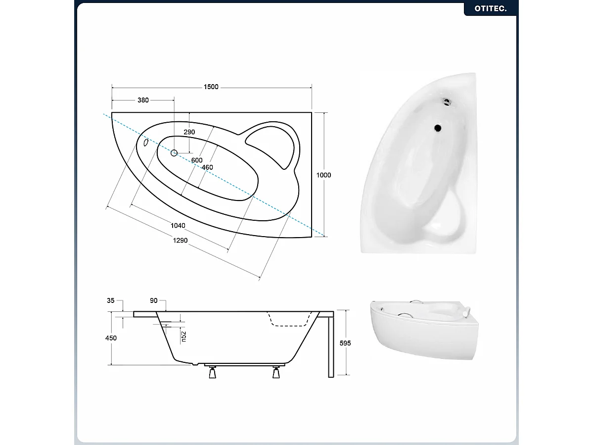 Baignoire asymétrique - 150 x 100 cm - Droite - sans Habillage - avec Pieds - Poignées - Repose-tête - Vidage Chrome - NATALIA PREMIUM
