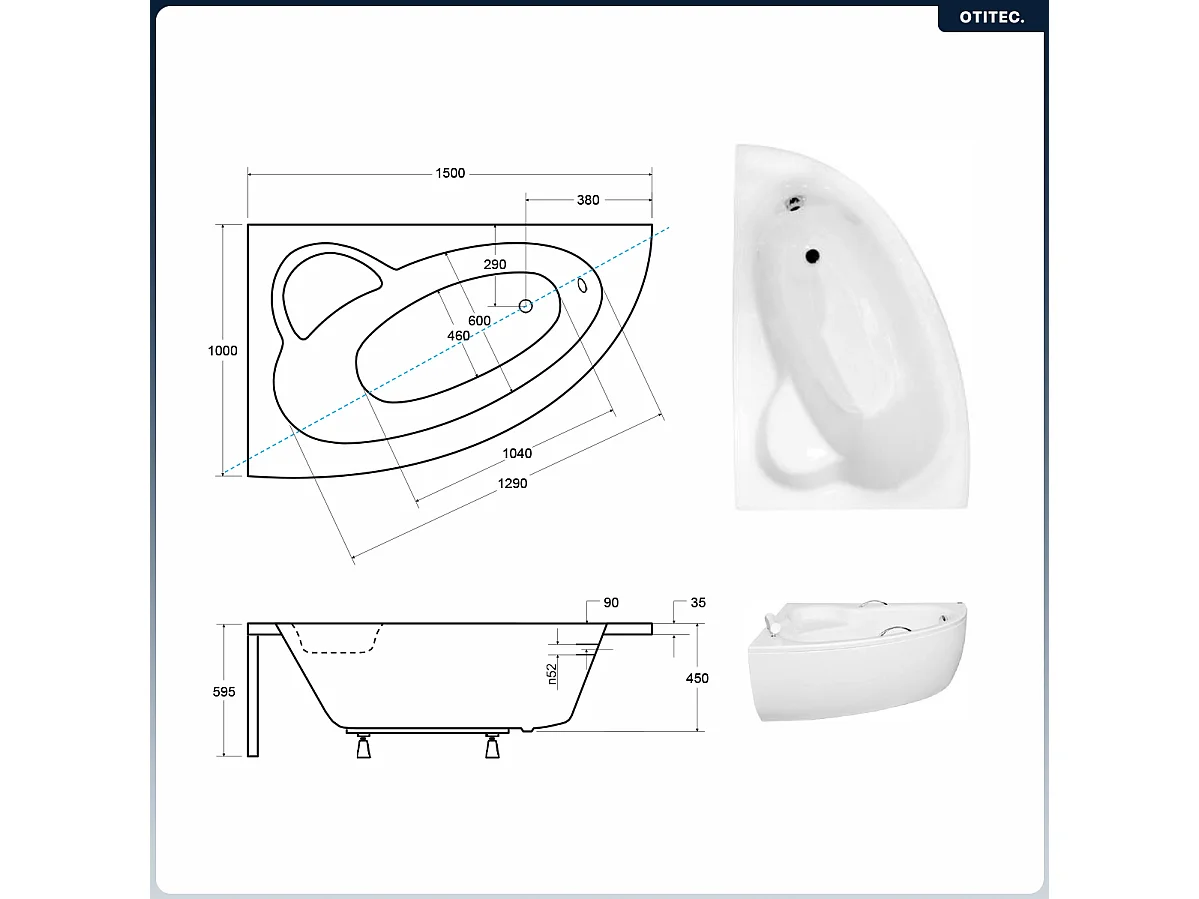 Baignoire asymétrique - 150 x 100 cm - Gauche - sans Habillage - avec Pieds - Poignées - Repose-tête - Vidage Chrome - NATALIA PREMIUM