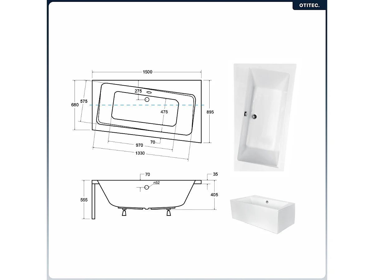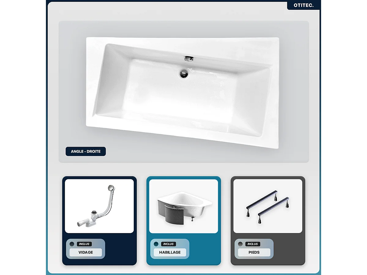 Baignoire asymétrique - 150 x 90 cm - Droite - avec Habillage - Pieds - Vidage Chrome - INFINITY