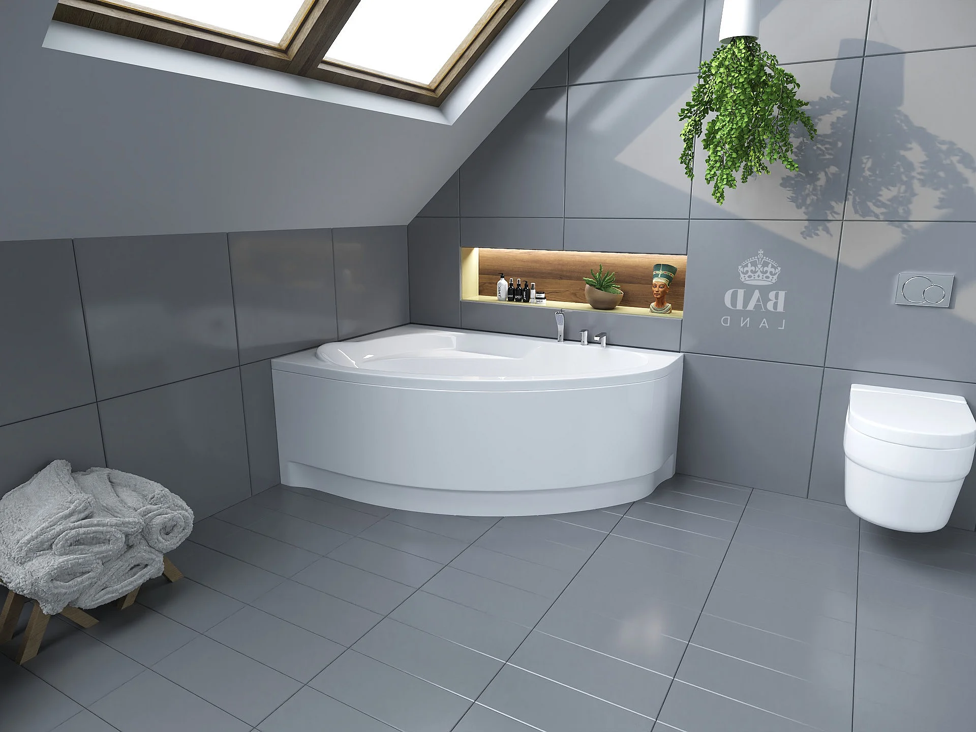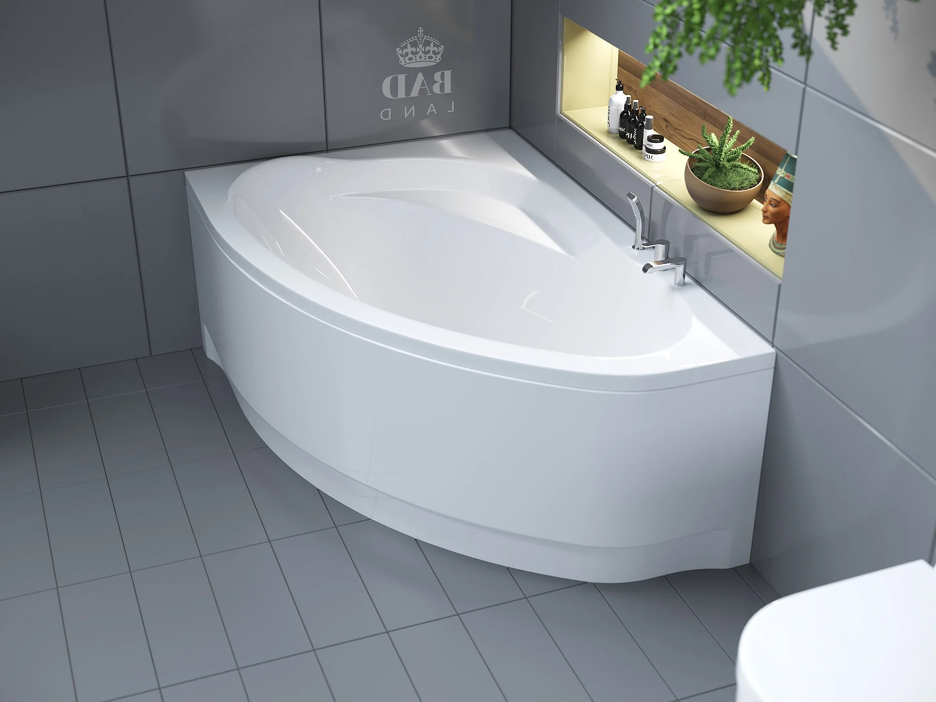 Baignoire asymétrique 150x100 Gauche MAREA acrylique blanc + avec Tablier + Pieds + Vidage à chromé