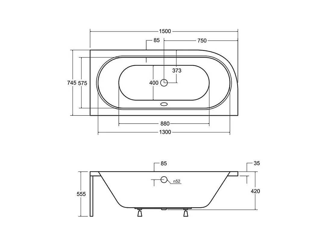 Baignoire asymétrique 150x75 Droite AVITA acrylique blanc, sans Habillage + Repose Tête + Pieds + Vidage à chromé