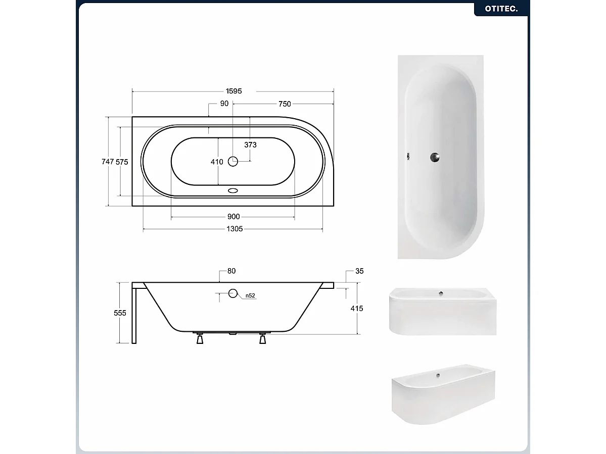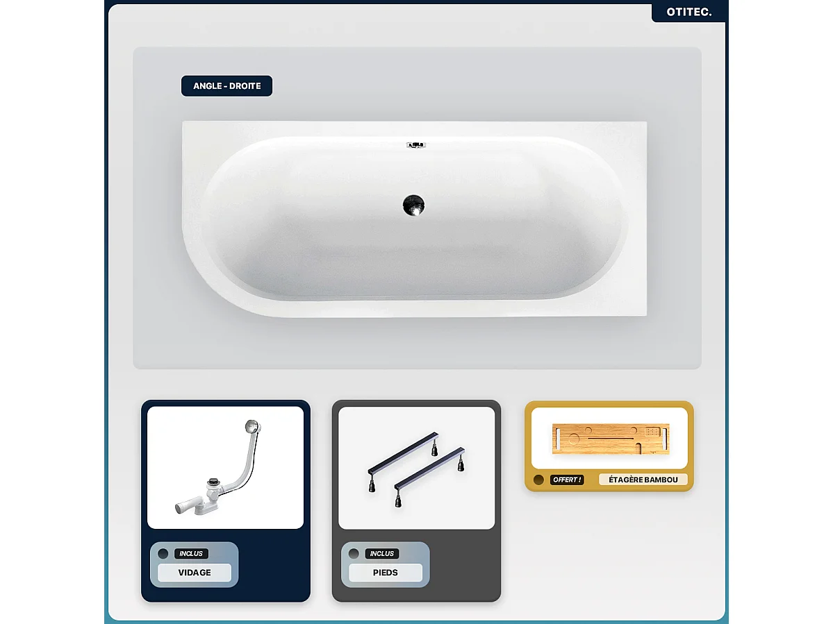 Baignoire asymétrique - 160 x 75 cm - Droite - sans Habillage - avec Pieds - Étagère bambou - Vidage Chrome - AVITA