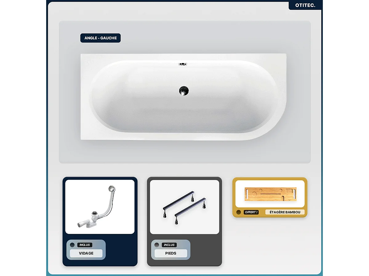Baignoire asymétrique - 160 x 75 cm - Gauche - sans Habillage - avec Pieds - Étagère bambou - Vidage Chrome - AVITA