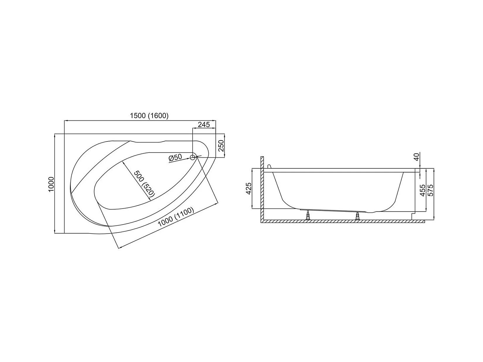 Baignoire asymétrique 160x100 Droite MAREA acrylique blanc + Habillage en polystyrène + Pieds + Vidage à chromé